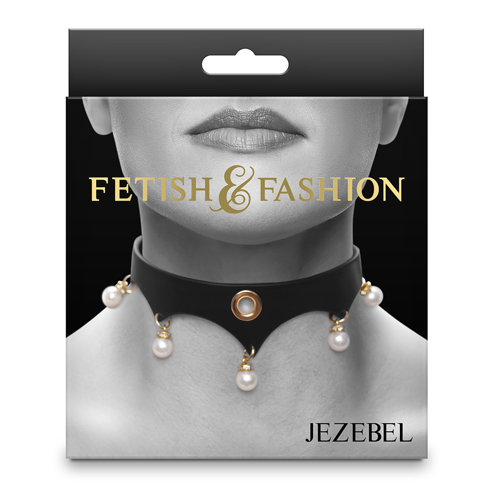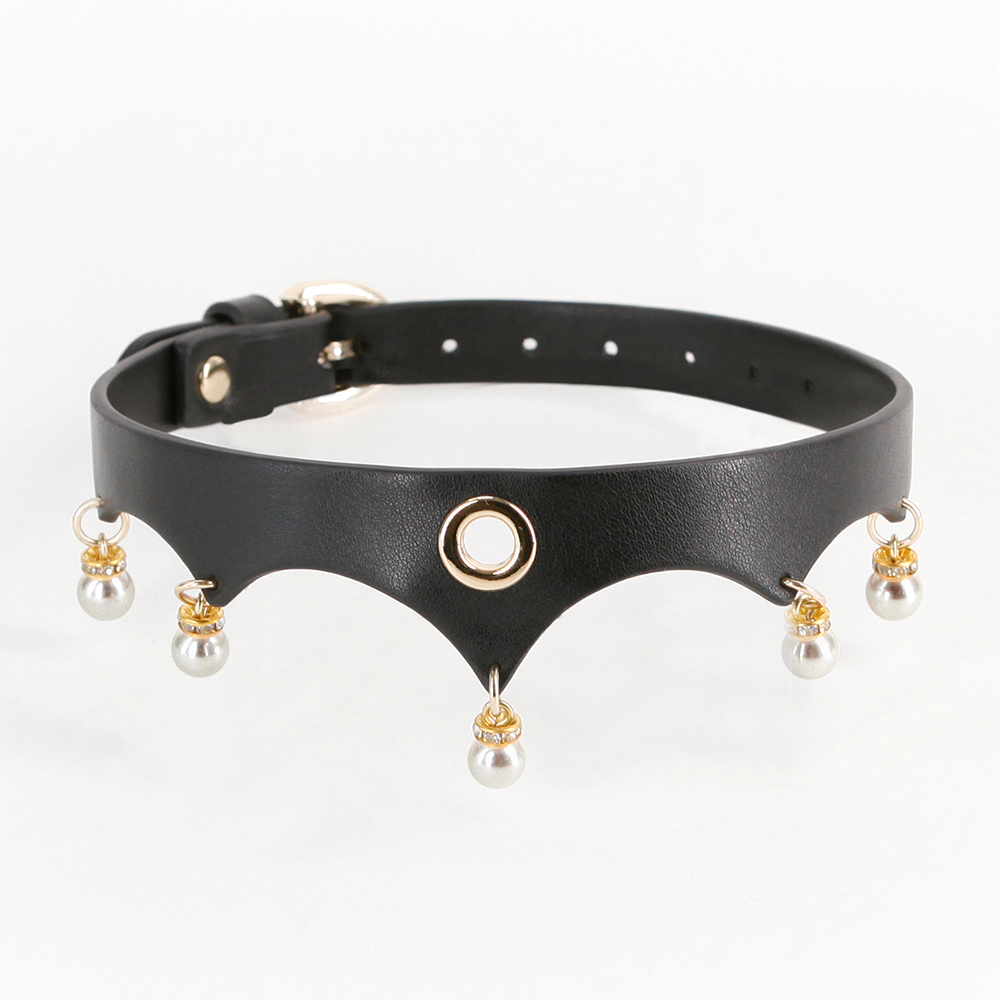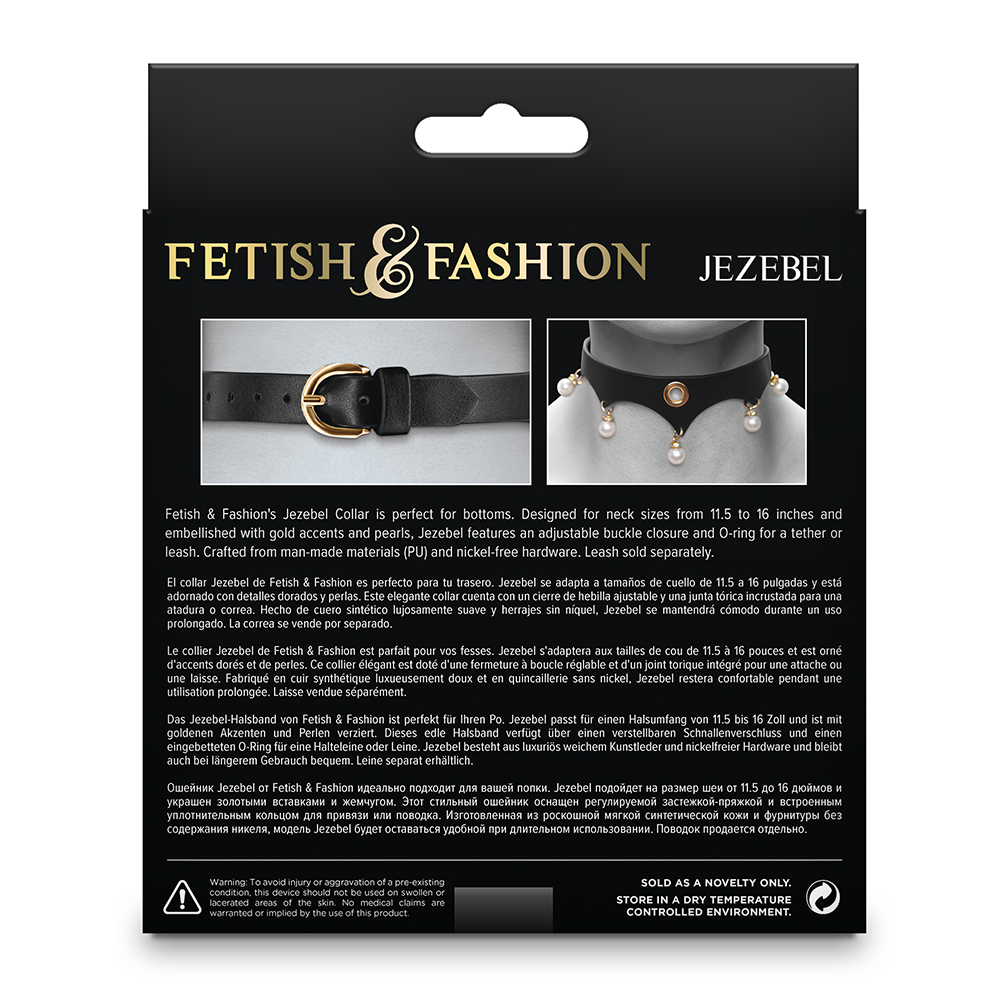 This beautiful bondage collar is made from ultra-soft faux leather with a stylish pointed, curved hem, encircling your neck just like an upside-down crown. From each point, gleaming faux pearls dangle delicately from sophisticated gold hardware, perfect for giving an elegant aesthetic to bedroom play or even an everyday outfit. The collar features a hole in the front for attaching a leash (sold separately) and is rimmed with a sturdy gold grommet that can withstand the tugs and pulls of restraint play. In the rear, the adjustable buckle lets you get a perfect fit while the keeper tucks the tail in for a flush finish. The Jezebel Collar is nickel-free to suit sensitive skin and features vegan-friendly materials for everyone to enjoy!