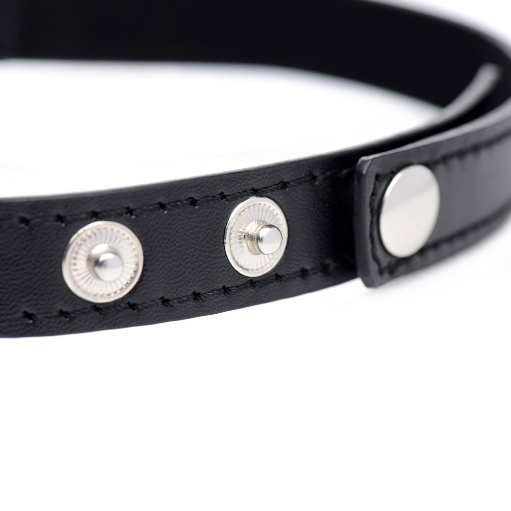 This sexy collar is made from cruelty-free vegan leather and has snap button closures for adjustable wear and easy removal. The interior lining is velvety-soft for comfortable wear, whether you're donning it exclusively in the bedroom or as an edgy accessory with everyday outfits. The nickel-free metal love heart makes the Master Series Chrome Heart Choker a perfect flirty gift for a partner or yourself!