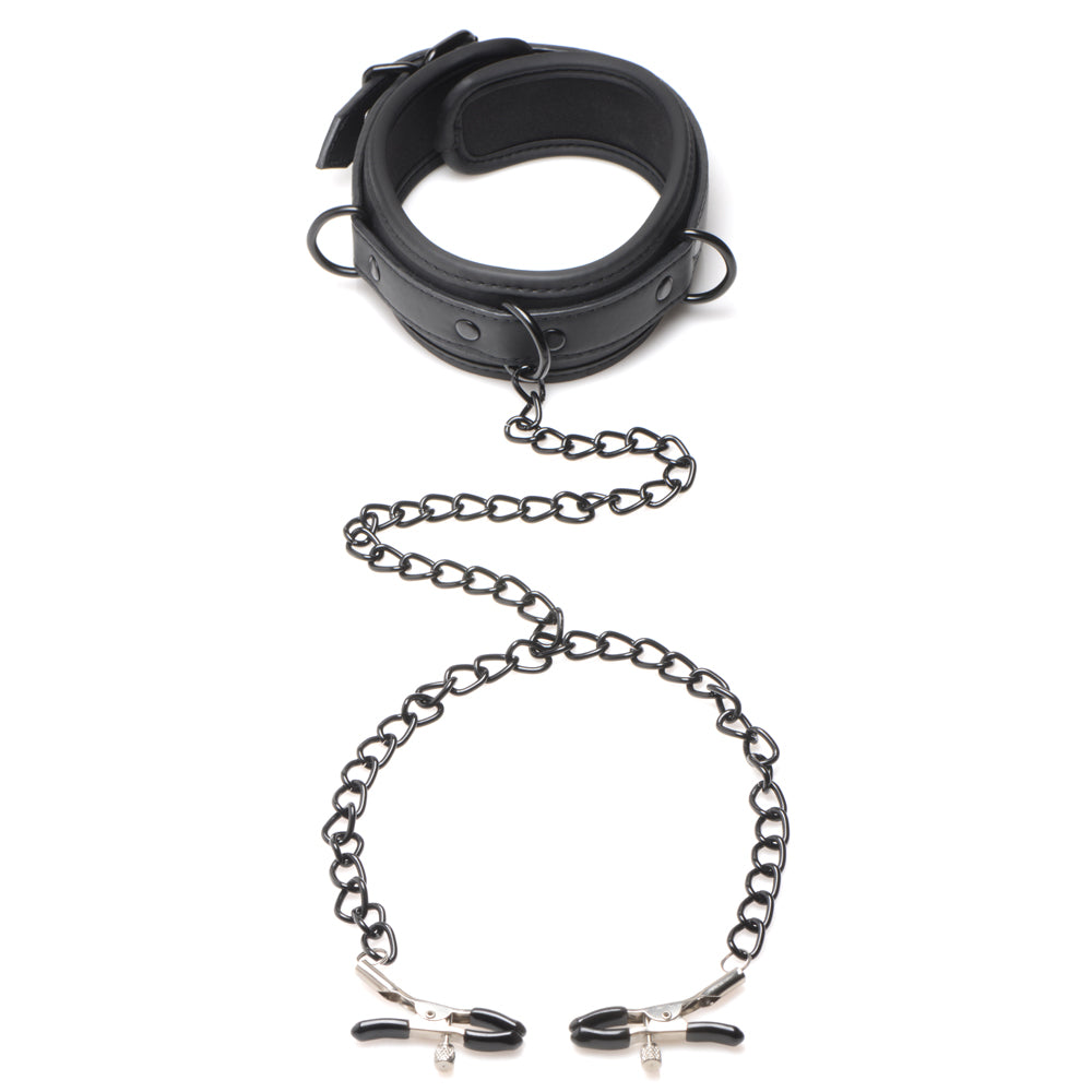 Take control of your submissive in style with the Collared Temptress Neoprene Collar & Nipple Clamps from Master Series®!