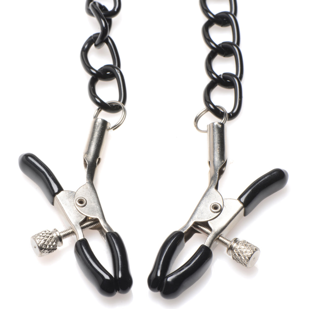 On the central D-ring, the Master Series Collared Temptress Collar has a split chain that holds the attached nipple clamps to remind your plaything of their place. The rubber-tipped nipple clamps have a fully adjustable tension screw so you can tailor the pinching pain and pleasure intensity with just a small tweak of your fingers! All the metal hardware is nickel-free to suit people with skin allergies so that everyone can play!