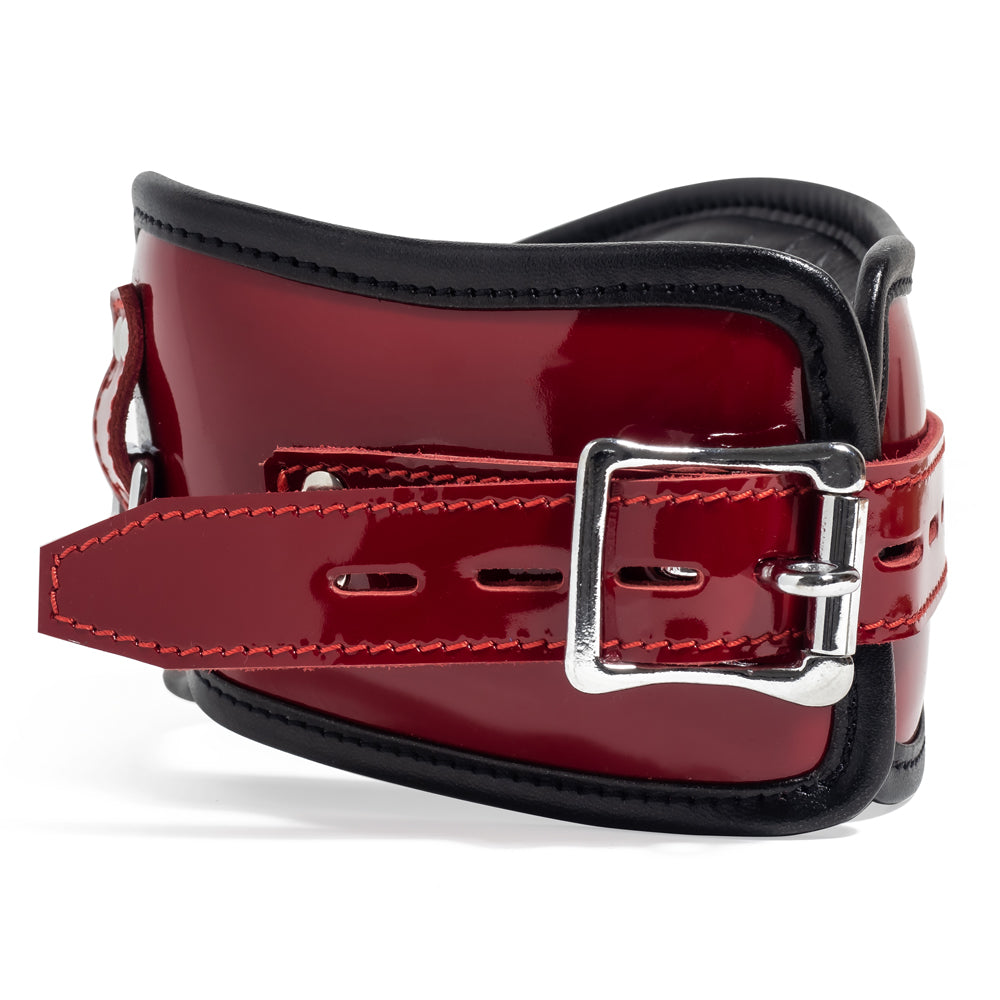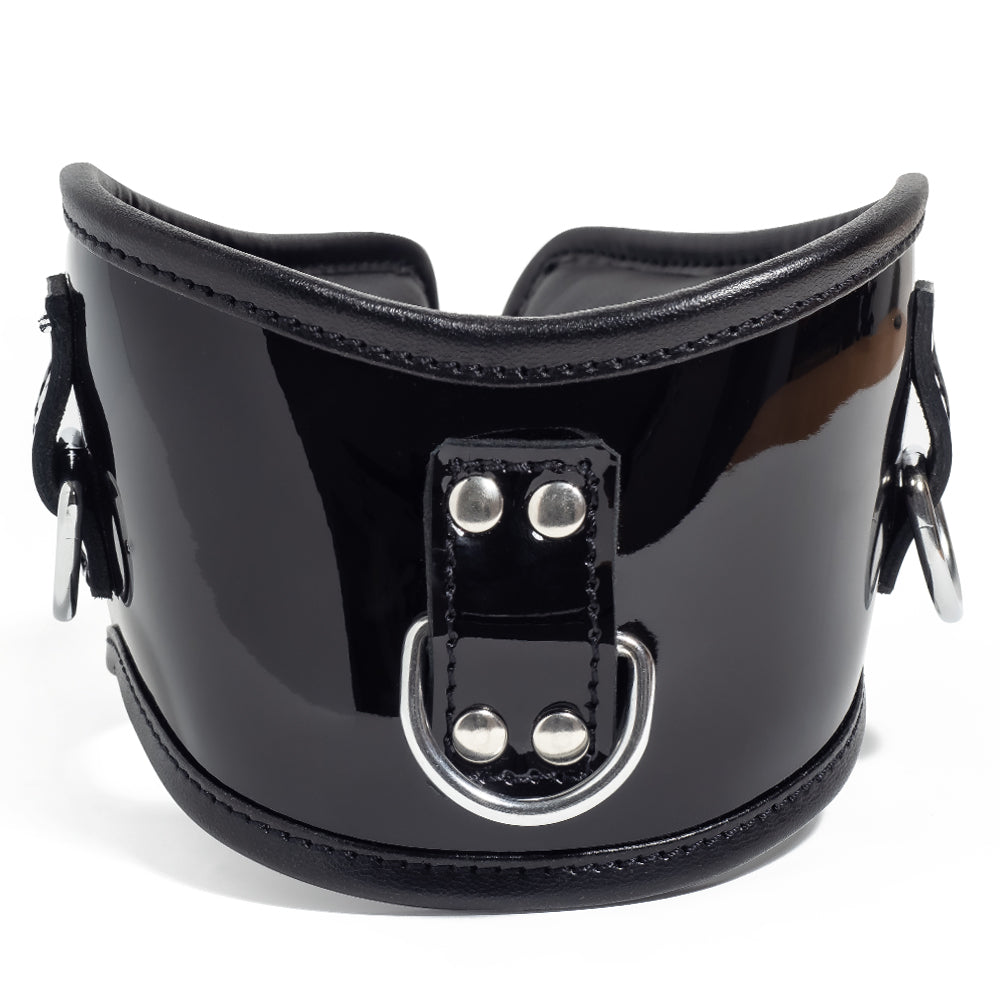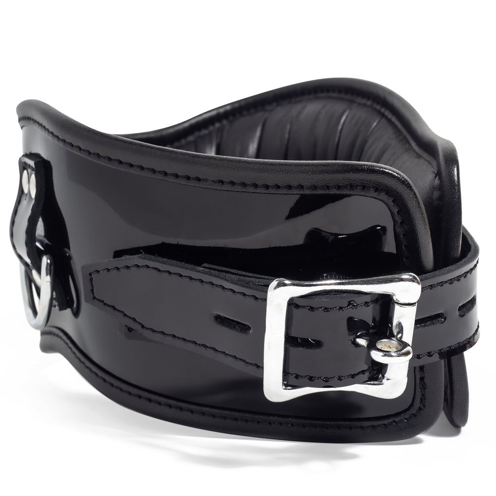 Zorba's Lockable Posture Collar firm design prevents the collar from collapsing when the wearer's head droops while the thick, padded interior keeps the wearer's throat comfortable during play and training. The high-shine patent leather offers a stylish finish that's perfect for catching the lights, either in the bedroom or at fetish clubs!
