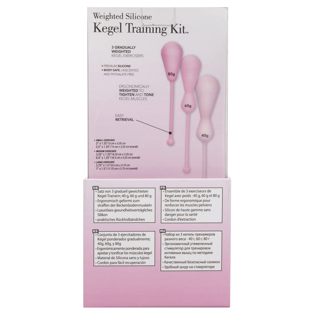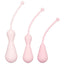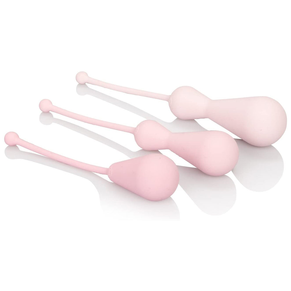 Each of the three exercisers sports an ergonomically rounded design for comfortable wear and smooth insertion, plus a retrieval cord for easy removal. The smooth silicone material is waterproof for easy cleaning and pairs well with water-based lubricant for a beautiful glide.