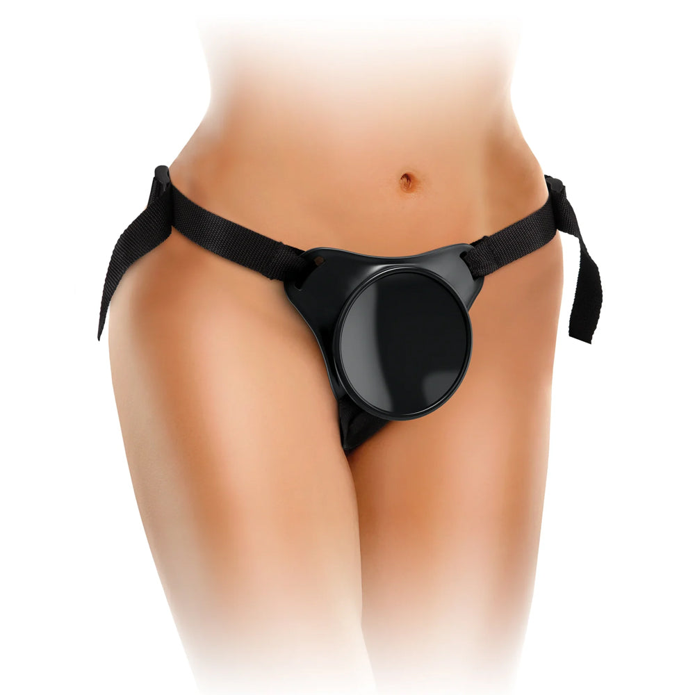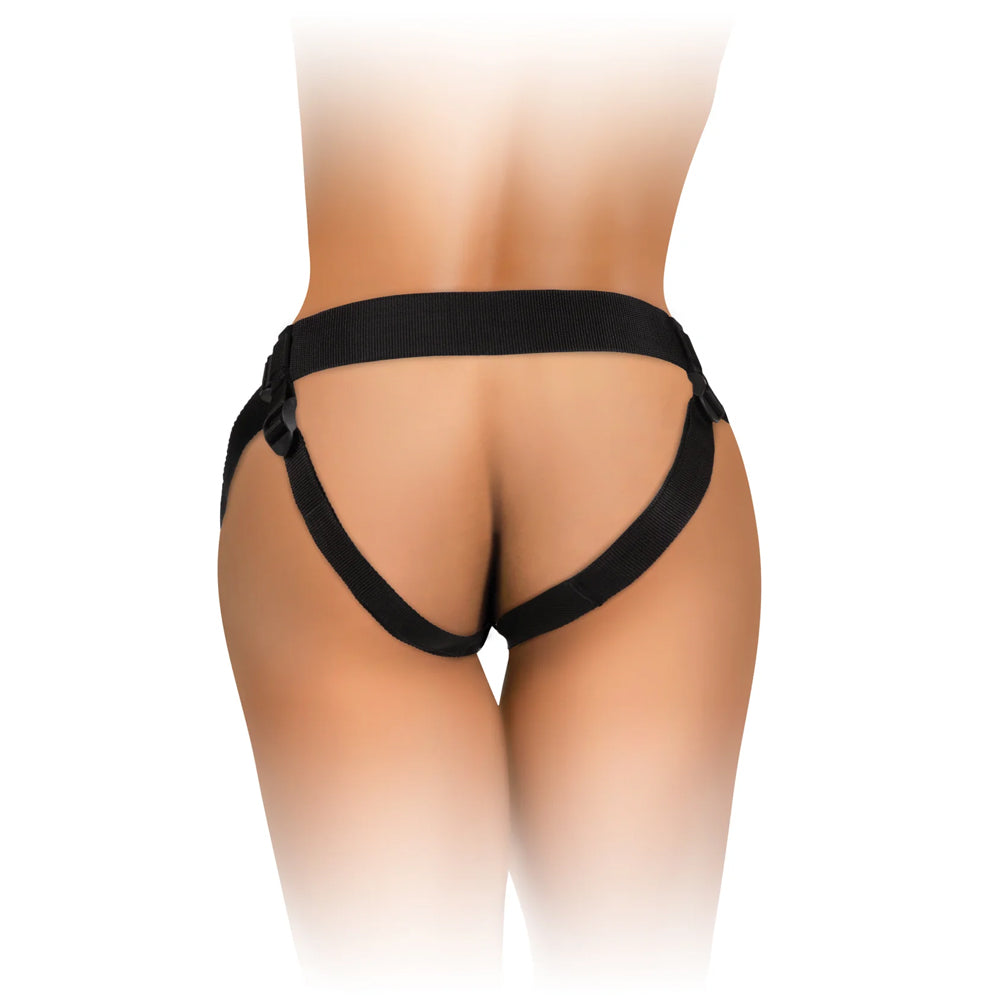 Speaking of swapping toys, the harness' docking plate can accommodate any toy with a suction cup measuring up to 8.6 centimetres or 3.4 inches in diameter, though if you're sticking with the included dildo, you're in for a treat! The dual-density Elite Silicone™ material packs a firm core inside a soft, flesh-like exterior for that realistic feeling you just can't resist, all in a beginner-friendly size.