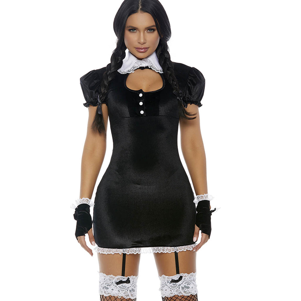 This 3-piece TV show character costume comes with a short-sleeved dress with scalloped lace details, lace top fishnet thigh-high stockings, and black fingerless gloves, all in luscious black velvet for that irresistible feeling under your hands. The cutout at your bust create a delicious window into your cleavage while the triple buttons underneath lets you customise the size of the cutout. The form-fitting design hugs your curves while the white, scalloped lace details add a feminine, vintage-inspired touch to your gothic look. The velvet dress has attached suspenders underneath the skirt to attach seamlessly to the thigh-high fishnets so you can look ultra-sultry from head to toe!