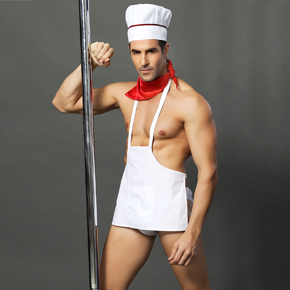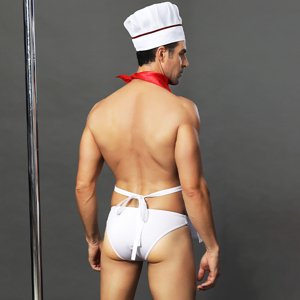 - Includes a cheeky-cut apron, briefs, a red neckerchief & a chef's hat