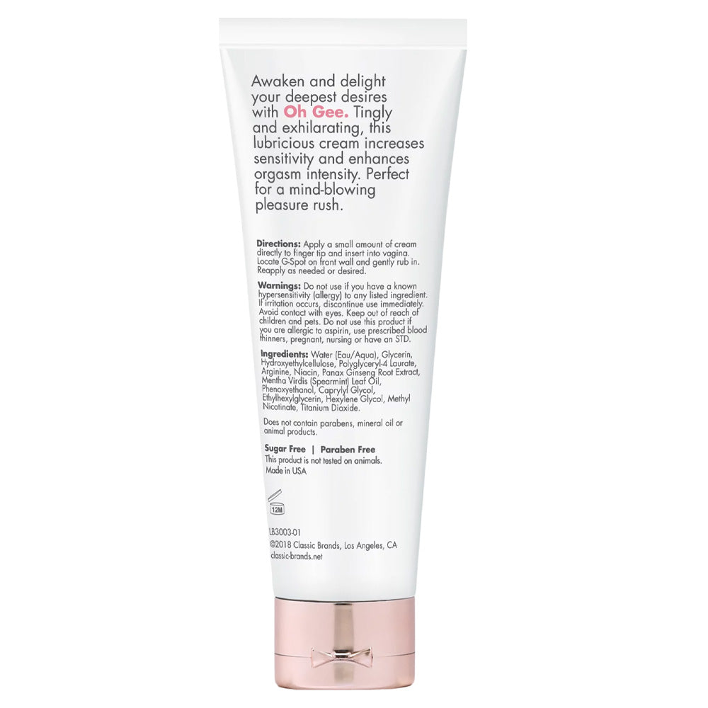 This exhilarating enhancer boosts blood flow and sensitivity in your G-spot for increased arousal and enhanced sensations, perfect for solo or partnered play. With this extra stimulation, the G-spot can become more pronounced so it's easier for you or a partner to locate, and as an added bonus, the Oh Gee Gel is specifically formulated to heighten orgasm intensity for earth-shattering climaxes!