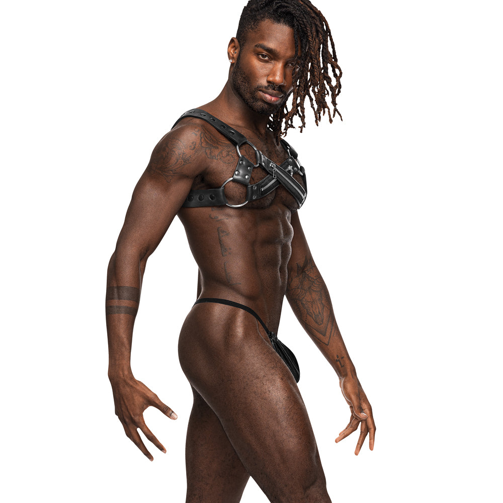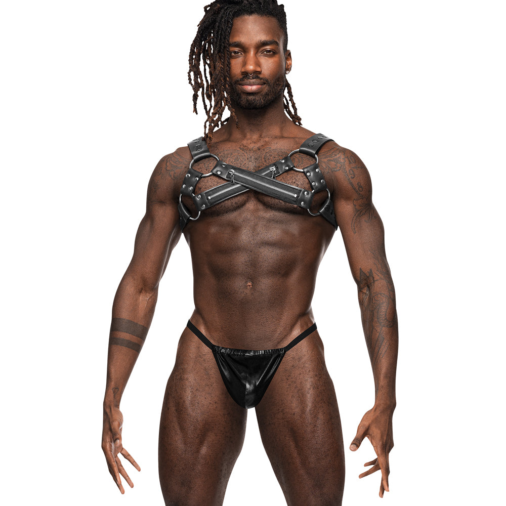 Make a statement inn the bedroom or at your next fetish event with Male Power's® Gemini Virgo Criss-Cross Zipper Neoprene Chest Harness!