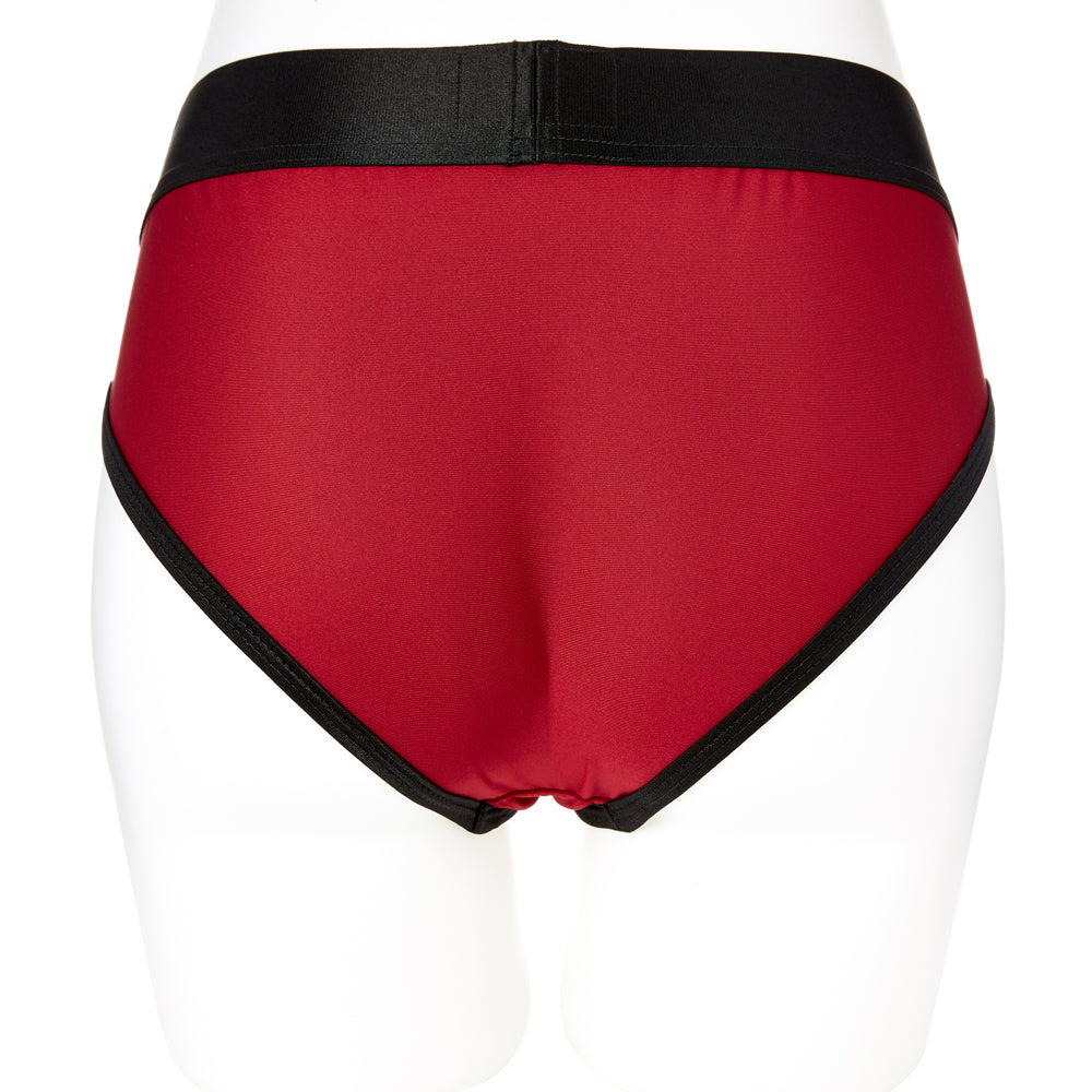 Forget about unwieldy straps and pinching buckles! This strap-on harness has been styled like a pair of high-cut jocks for the ultimate comfort, durability, and fit while showing off your cheeks. The wide elastic waistband and stretchy fabric feel oh-so-soft against your skin and also wick moisture away so you can stay cool and dry while you play. Your toys (sold separately) are sure to stay securely in place thanks to the dual-layered fabric that holds the flared base of your toy behind the built-in nitrile rubber O-ring. For even more fun, the Sportsheets Contour Harness also has 2 slot holders for bullet vibrators that stimulate your clitoris while you please your lover. It even comes with its own travel pouch so you can take your harness everywhere, though it's so comfortable you could totally wear it through your flight!