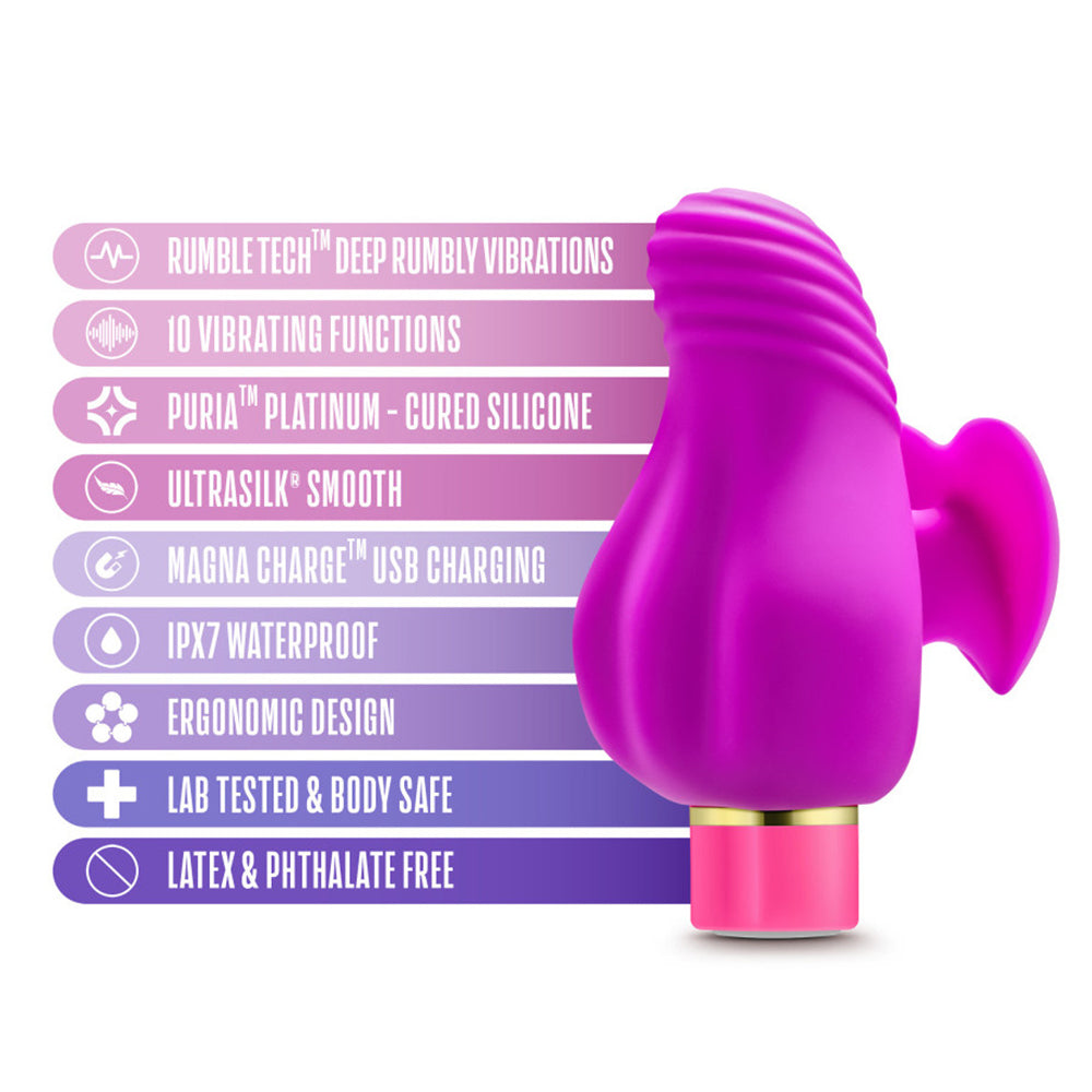 This gender-neutral sex toy features a heart-shaped fin that separates your hand from the intense vibrations while also nestling naturally between your index and middle fingers for optimal grip. You'll be able to comfortably navigate this buzzing beauty all over your body or a partner's, rubbing the ribbed, tapered tip against your most sensitive sweet spots with ease! The 10 vibration modes (5 steady speeds and 5 pulsing patterns) are powered by a super-strong RumbleTech™ motor, meaning this petite adult toy packs a surprising amount of punch!