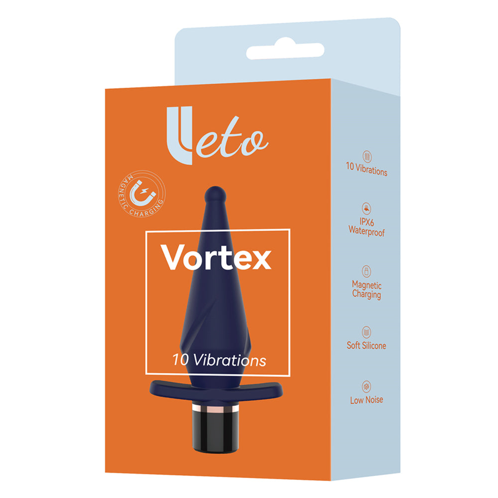 This sleek little butt plug is a great anal play option for backdoor beginners and experts alike thanks to the flexible tapered tip, which not only makes insertion more comfortable but also concentrates the vibrations deeper inside you. Underneath the plug, a single button lets you cycle through 10 vibration patterns for thrilling stimulation you won't be able to get enough of! The T-shaped base acts as both a safety stopper to hold the plug at a safe depth and an easy-pull handle to remove the plug once your fun is done. Afterwards, the Vortex Anal Plug is easy to clean thanks to the water-resistant silicone design — just add warm water and toy cleaner, then aim the included power cable at the magnetic charging points to power up your Vortex for the next round!