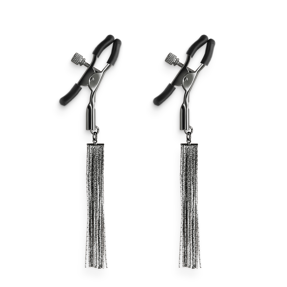 These nickel-free nipple clamps deliver the iconic pinching sensation you know and love, tantalising your nipples with your perfect amount of pinching pleasure and pain. The silicone-covered tips keep you comfortable while the adjustable tension screws let you customise the pinching intensity for sensations that are tailor-made for you! Decorative tasselled chains drape elegantly from each nipple, clinking quietly together and tickling your sensitive breasts as they sway with your every move. Pair these clamps with your favourite lingerie or burlesque outfit and let the elegant gunmetal tone shine as you strut your stuff under sensual lighting...