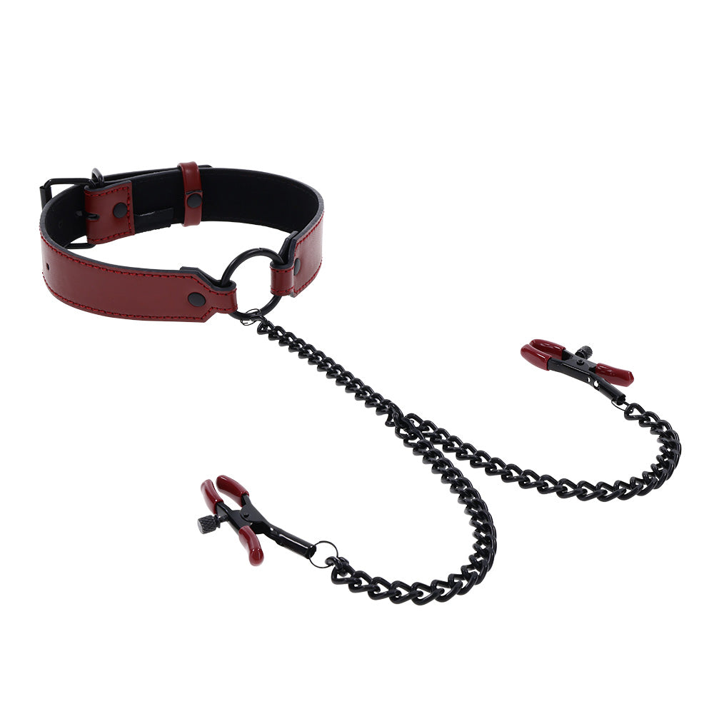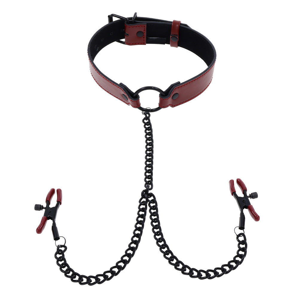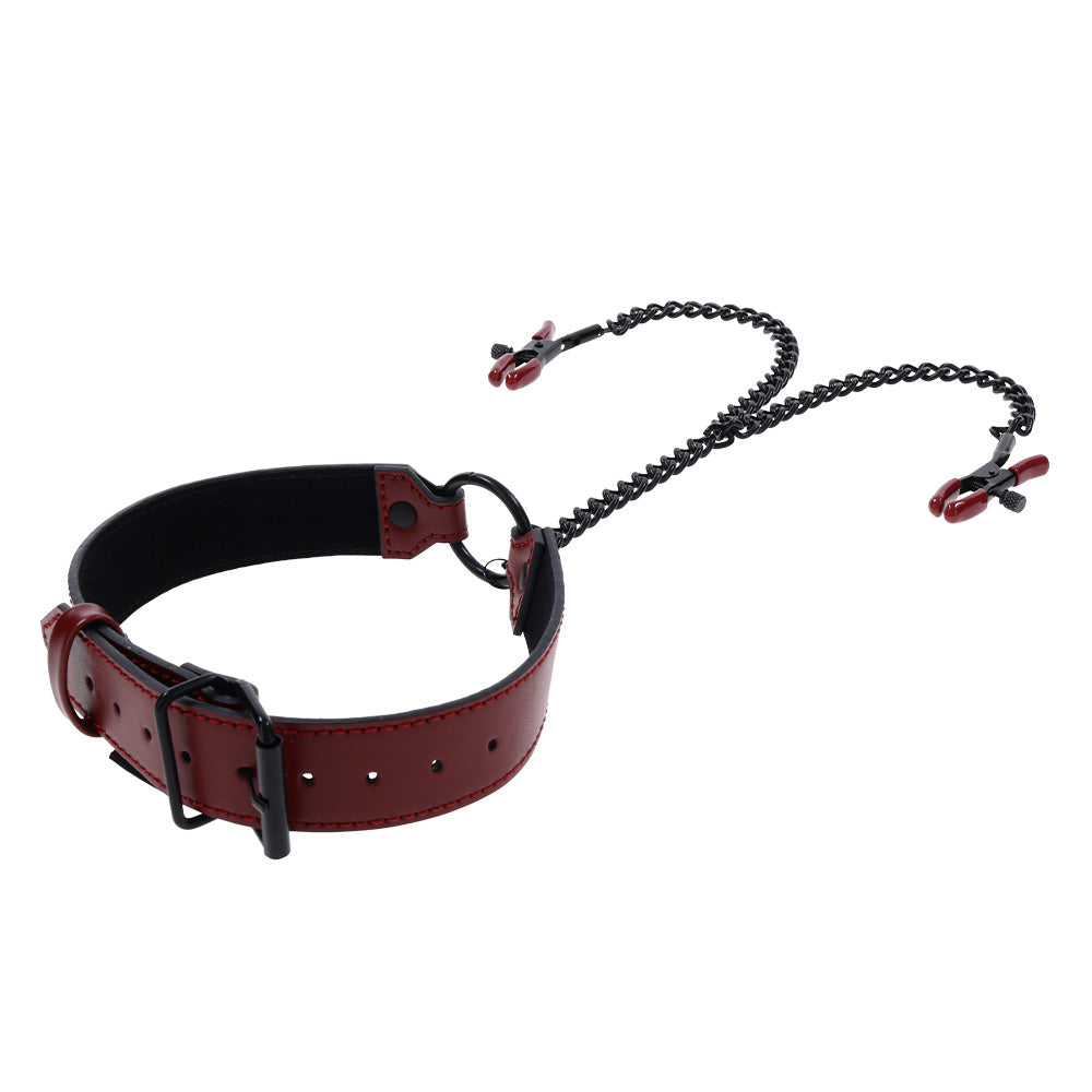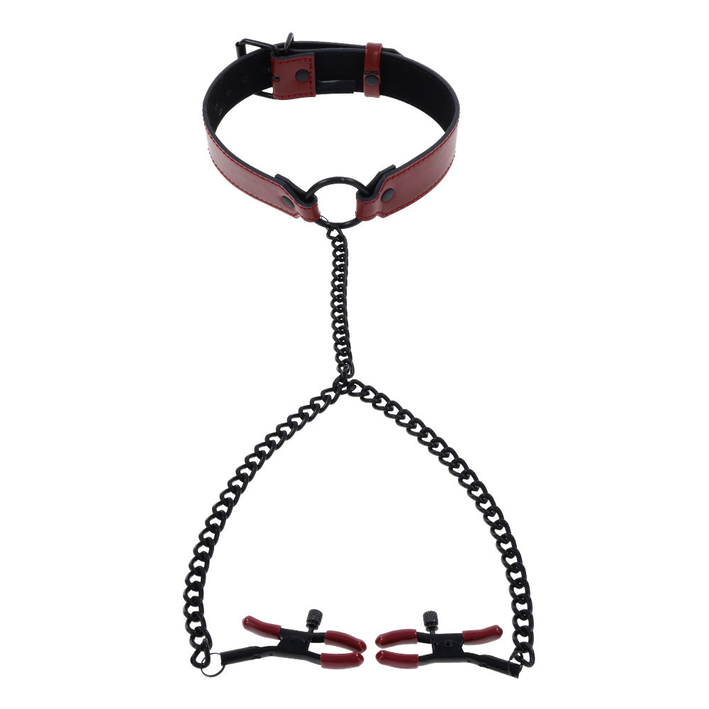 This sexy collar is made from vegan-friendly faux leather in a striking shade of deep red with a large metal O-ring at the centre of your throat that connects to the nipple clamps for a cohesive look. The clamps are tipped with removable rubber covers so you can tailor the pain level of the pinch, along with the adjustable tension screws to find the perfect level of intensity. The clamps are attached to the collar via chains that you can tug on to tease and tantalise your plaything, and you can even attach a leash (sold separately) to the central O-ring and lead your lover around like an obedient pet in the bedroom or at BDSM events...