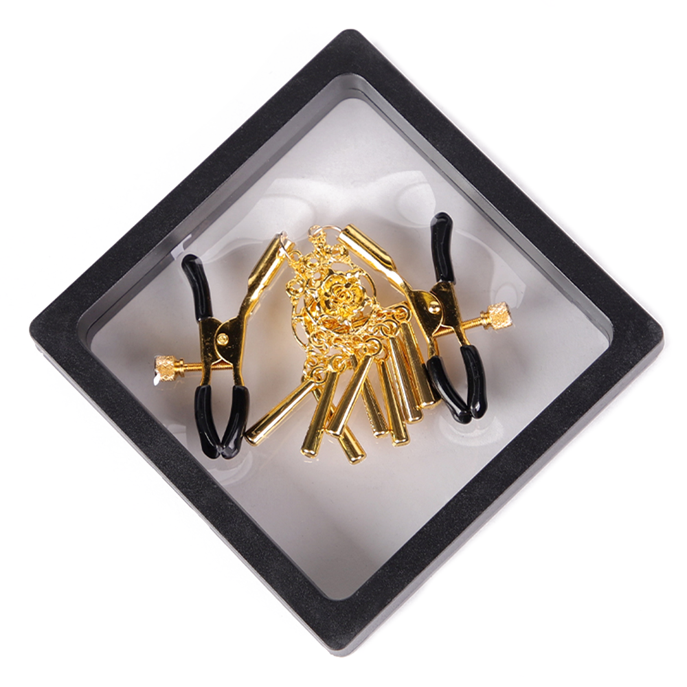 These gleaming gold nipple clamps each feature a beautiful rose charm to add a feminine, floral touch to your kinky nipple play and are finished with a trio of dangling bars that clink gently together with your every move, just like a windchime. The rubber-covered tips offer a more comfortable fit (or you can remove them for a more intense pinch), and you can adjust the pressure by twisting the tension screws on the sides, perfect for nipple play beginners and enthusiasts alike!
