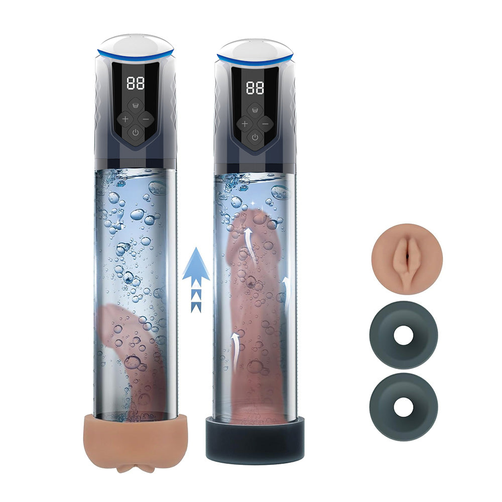 This automatic penis pump has 5 levels of suction to draw blood flow into your penis, displaying the pressure inside the chamber in kPa so you know exactly how much you're enduring and where the sweet spot is. The pump comes with two differently-sized silicone donuts and a sculpted vagina sleeve that fit around the pump cylinder's opening to form a comfortable and visually stimulating seal around your shaft while also creating an airtight hold on the internal pressure!