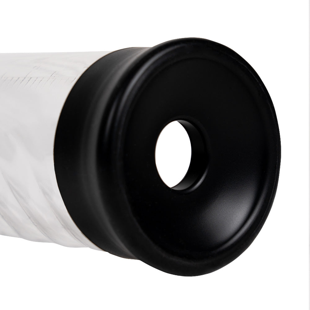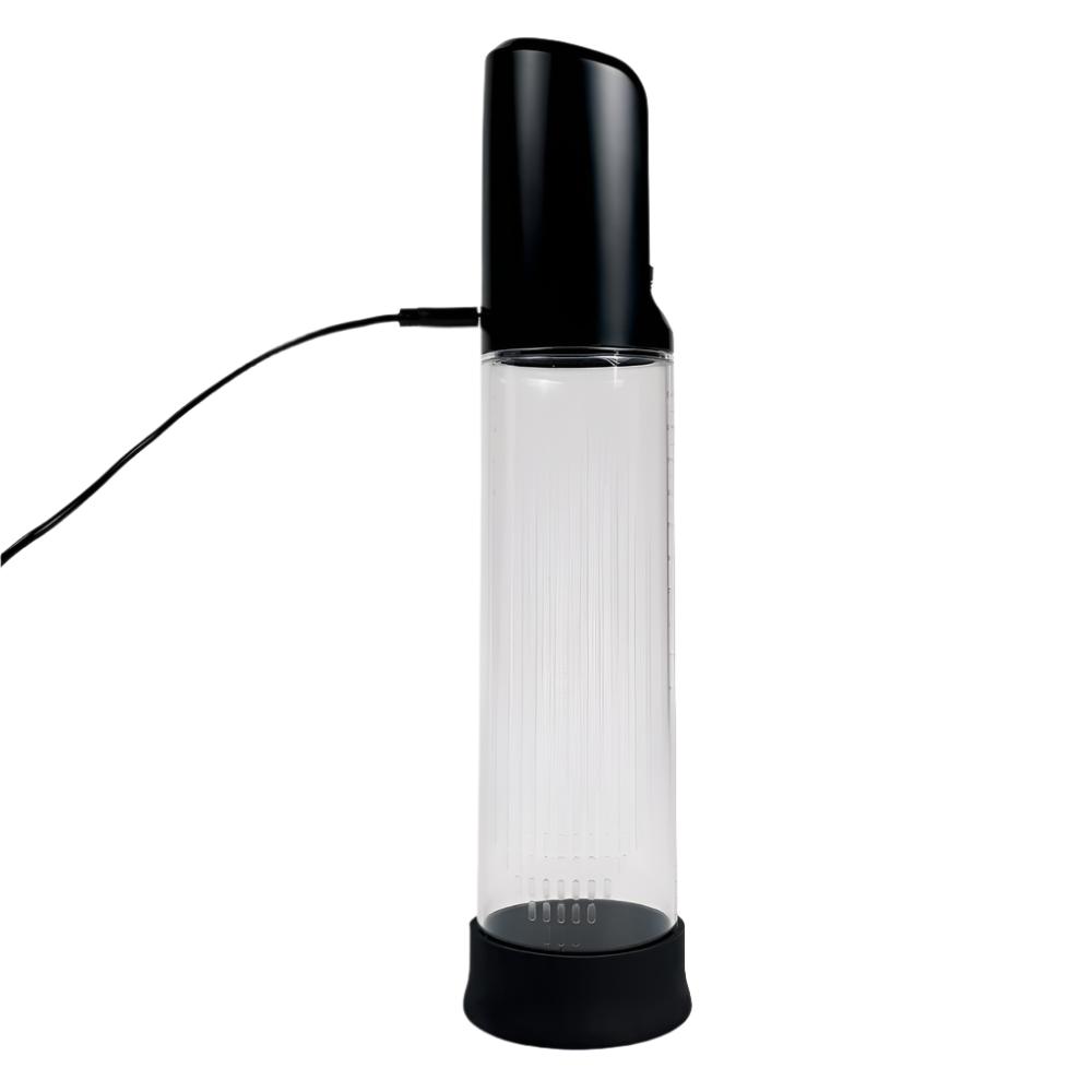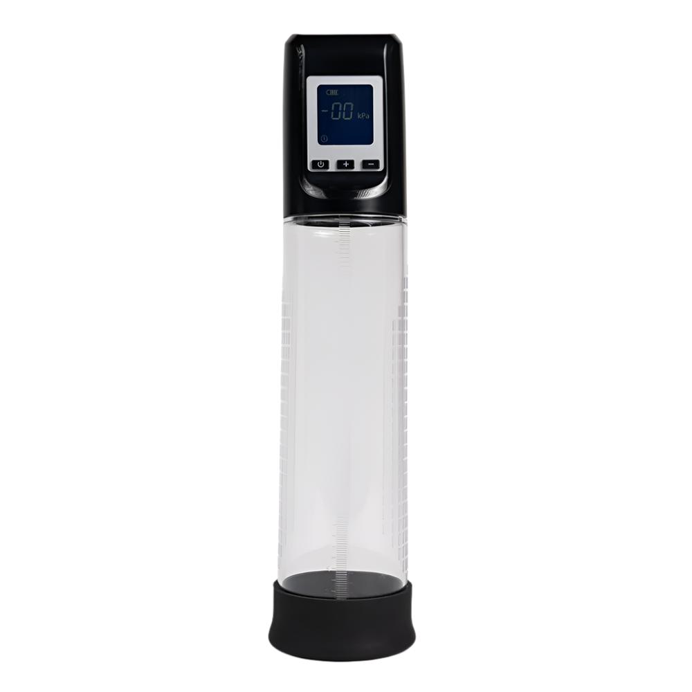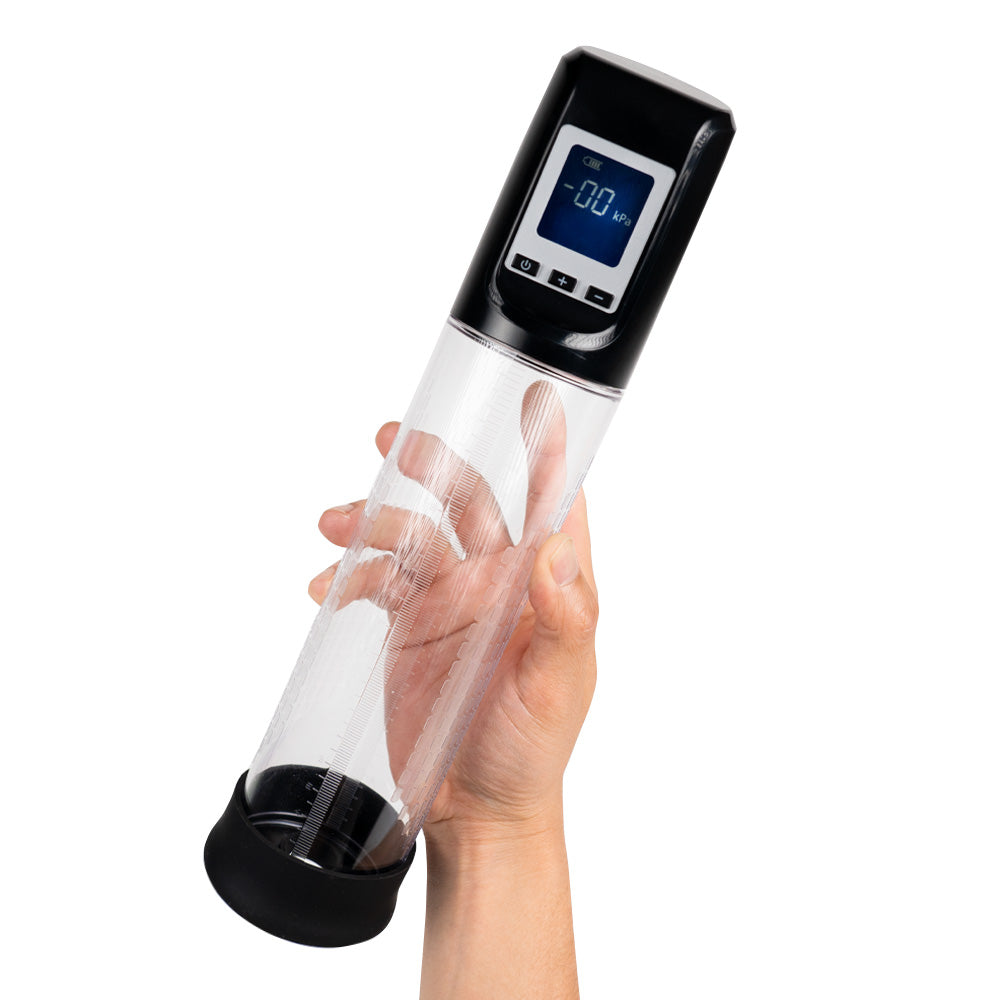 This penis pump takes erection enhancement to new heights of power and convenience thanks to its motorised design, which comes pre-programmed with 6 automatic suction modes that draw blood flow into your penis, giving you stronger, longer-lasting erections at just the touch of a button. The LCD interface displays the pressure level inside the chamber in kPa (kilopascals), the current suction mode you're currently using, and the remaining battery level of the pump so you never get caught out by a low or depleted battery. The clear chamber lets you watch your erection growing in real time and you can keep an eye on your progress by using the metric (cm) markings on the side of the pump to keep track of any size increases too!