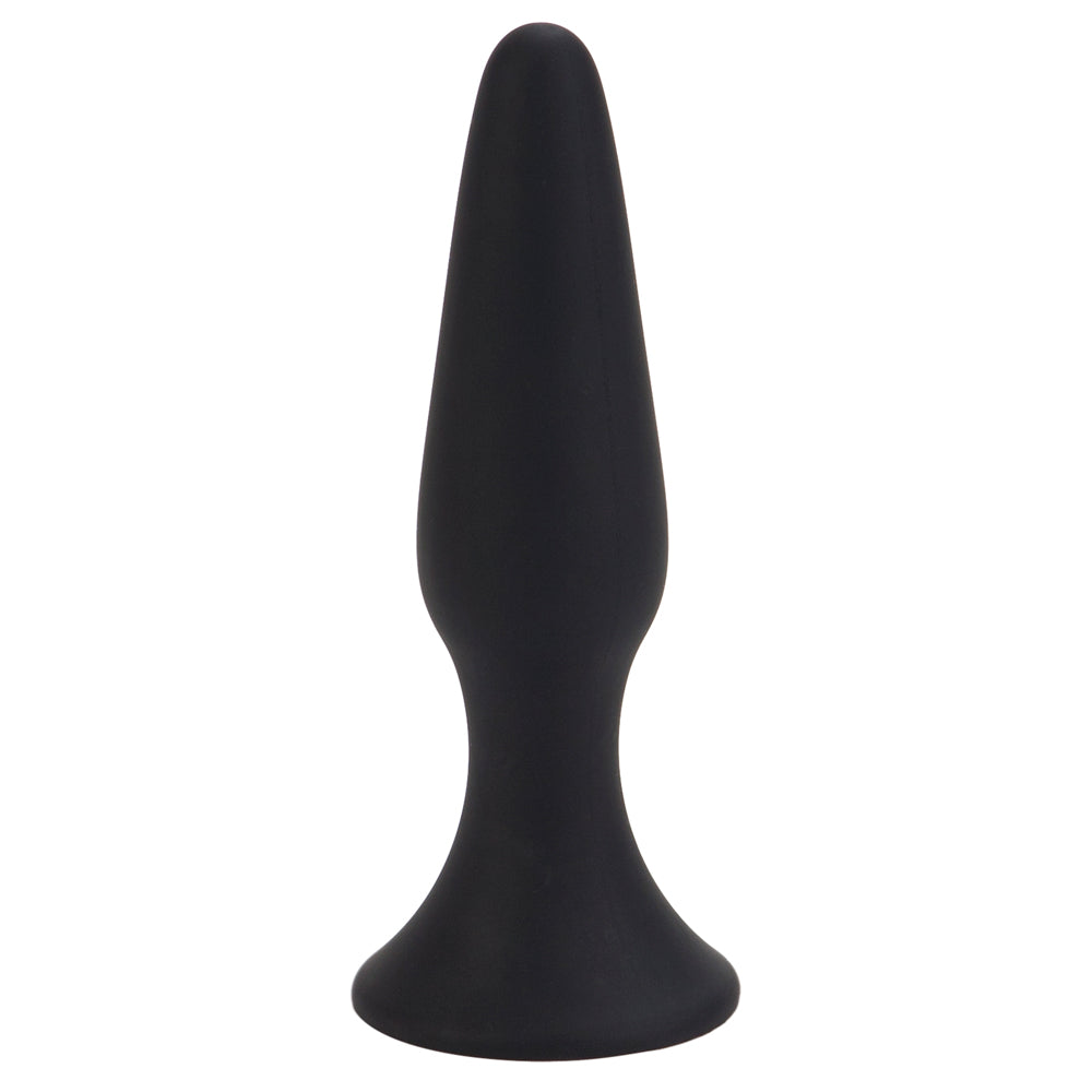 The Anal Explorer Kit's butt plug has a slender tapered tip for comfortable insertion and also has a flared suction cup base that prevents the plug from going further inside. The suction cup also lets you mount the plug to any flat, solid surface for a hands-free experience!