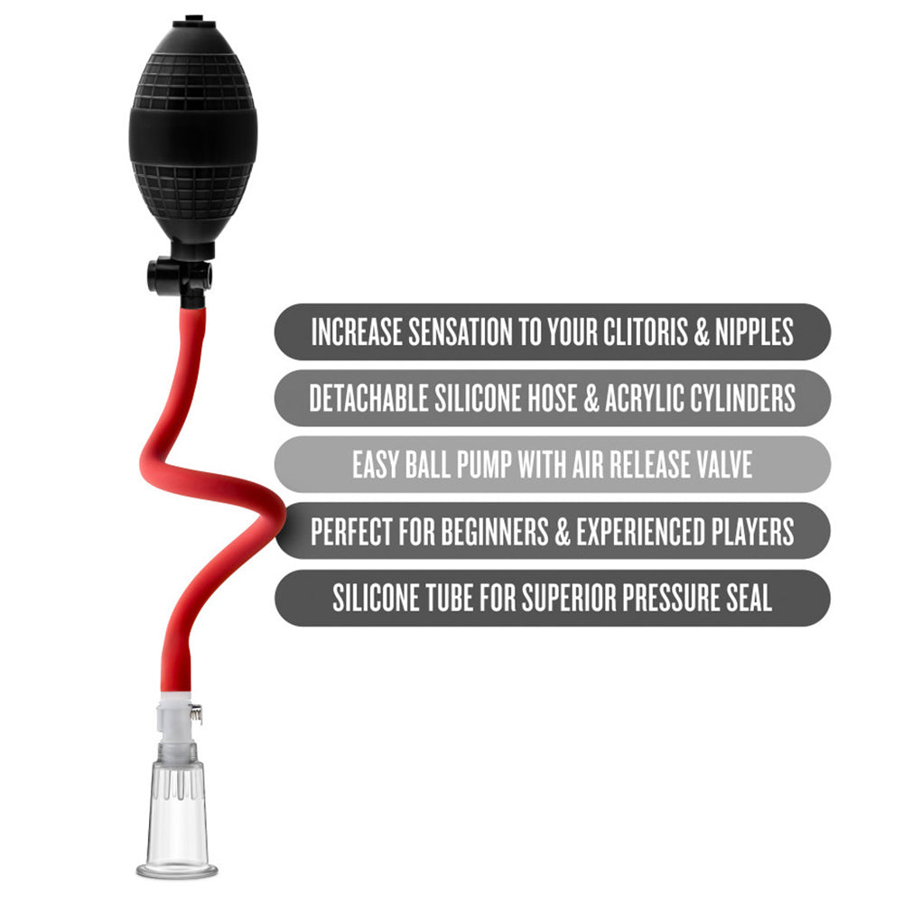 The Temptasia Beginner's Clitoral Pumping System is easy to use thanks to its convenient medical-grade pump ball, detachable hose, and air-release valve. Simply place the chamber cylinder over your clitoris or clitoral hood and squeeze the bulb by hand to increase the vacuum pressure from gentle to strong if you're craving more stimulation. The silicone tube provides a superior pressure seal while the easy-release button reduces pressure and lets you detach the hose from the cylinder, leaving your clitoris or nipple suctioned to the chamber and throbbing with pleasure!