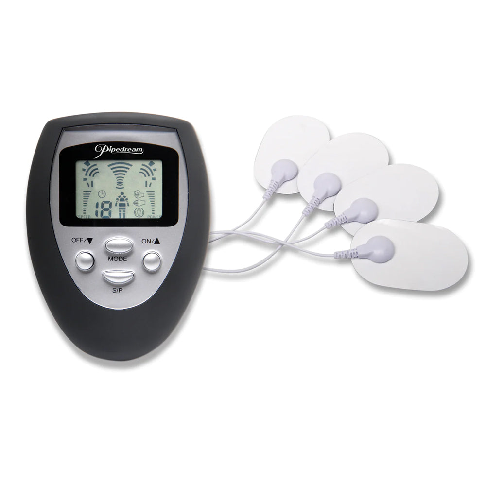 This electrifying sex kit is perfect for first-timers and e-stimulation enthusiasts alike and includes a control unit, adhesive pads, nipple clamps, a cock cage, and a pleasure probe.