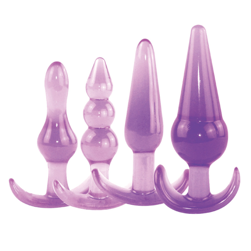 This quartet of anal plugs is made of firm yet squishy jelly material for a comfortable amount of flex and the ability to keep up with all your moves. The variety of unique shapes keeps you full of different sensations and each plug has a curved handle for easy removal after you've had your fill of fun!
