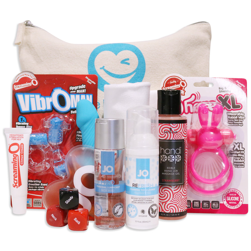 • Comes with a vibrating cockring, 3-piece vibrating ring kit (cockring, tongue vibrator & finger vibrator), mini vibrator, clitoral stimulant cream, water-based lubricant & foaming toy cleaner