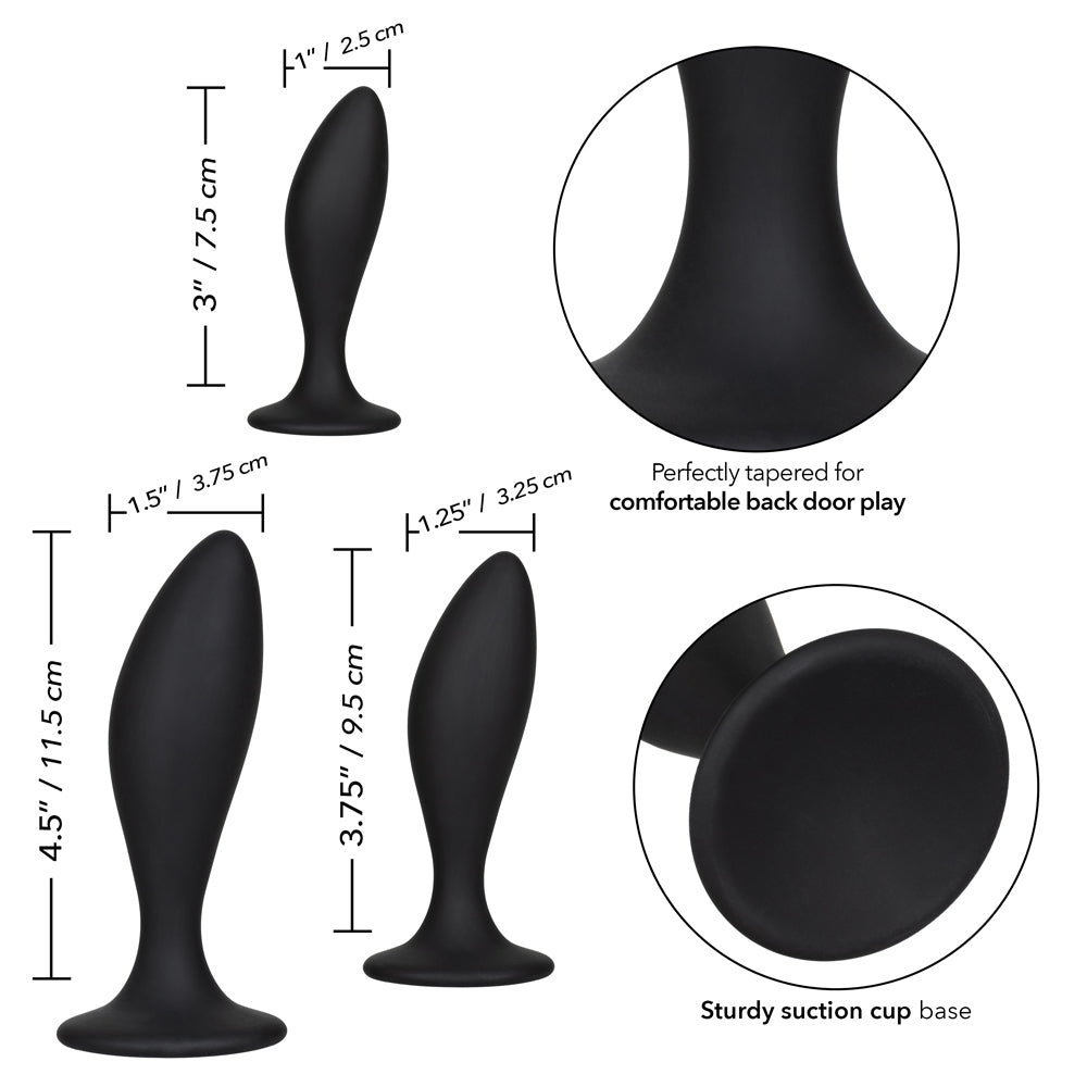 This trio of graduating anal plugs have tapered tips and a gently curved shape for comfortable insertion that hits just the right spots inside you, increasing in length and girth so you can progress at your own pace. Each plug has a suction cup base that lets you enjoy yourself hands-free against firm, flat surfaces, and the suction cups also double as flared stoppers to keep the plug at a safe depth between your cheeks.