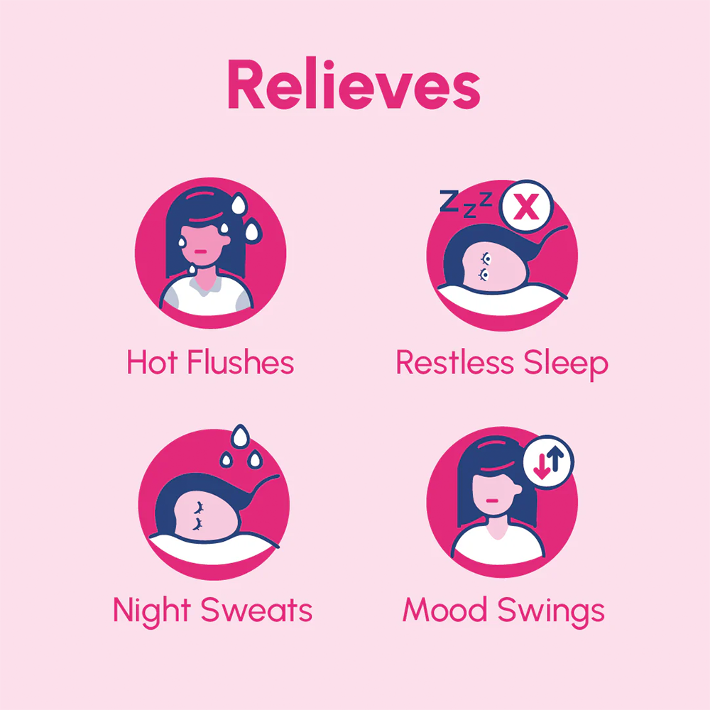 - Reduces intense hot flashes, night sweats, mood swings & brain fog