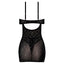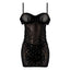 This eye-catching lingerie dress sheathes your full figure in sheer stretch mesh that lets your skin peep through the transparent material and is decorated with shiny gold sequins for a stunning starry-night effect. The underwired sweetheart bust helps to support and shape your breasts, wrapping around your back with standard hook-and-eye closure for easy wear or removal. Meanwhile, a criss-cross strappy detail with luxurious gold beading bridges the generous cutouts on either side of your torso, revealing your ribs, waist, and hips for tantalising view from all angles! The included tanga-style panty is visible through the open sides, as well as through the sheer mesh, letting your lucky onlookers see the thong's intricate cutout details and cheeky rear that lets your buns steal the show from behind...