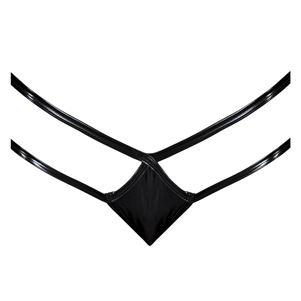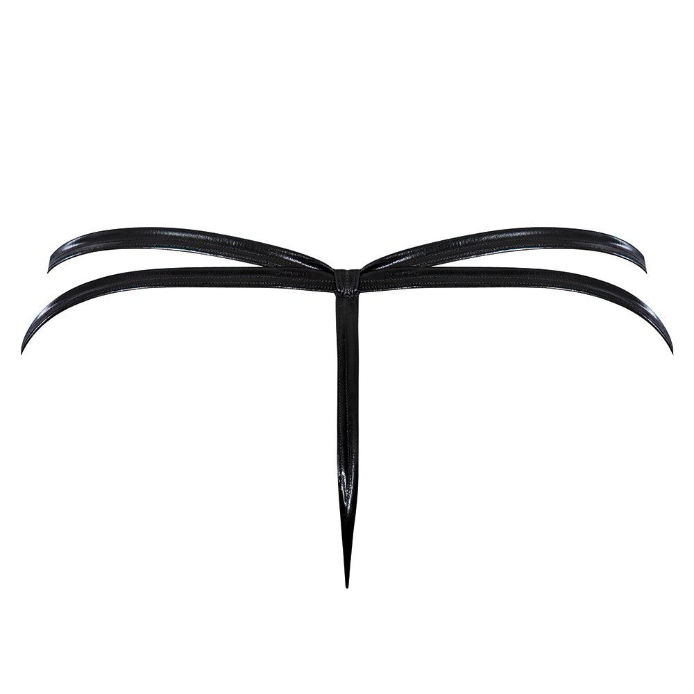 Key features of the Exposed Liquid Onyx Wet Look Strappy Cutout Crotchless Thong: