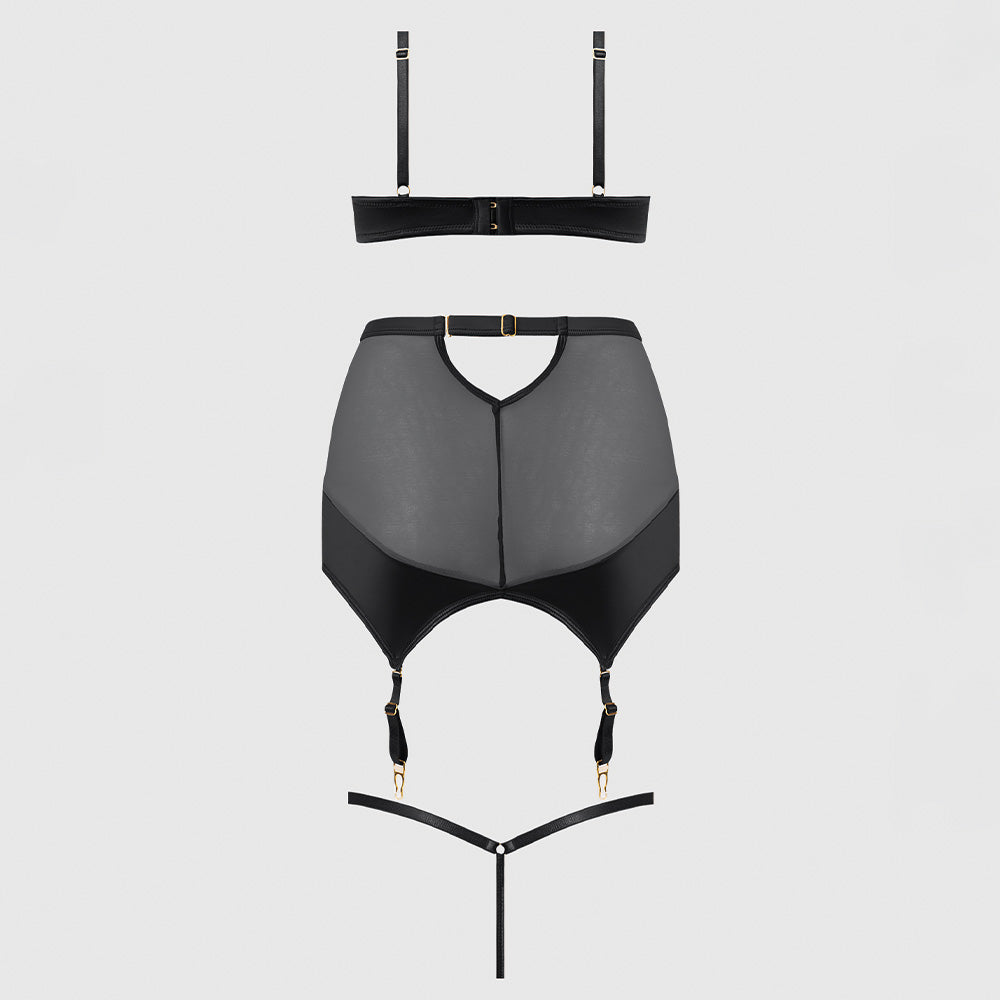 This 3-piece lingerie set flatters your curves with a sensual combo of transparent mesh and buttery-soft satin microfibre accents for a sleek aesthetic to suit a modern muse like you. The bra's underwired cups provide bust support, lift, and shaping while the sheer mesh upper cup lets your skin breathe in a playful peekaboo effect. The barely-there G-string has satin elastic sides you can easily wear above your hips for a high-cut look that highlights the curve of your waist and hips while also making your legs look miles long! The back is just as interesting as the front of course, with a strappy little rear that reveals your buns to the max!