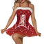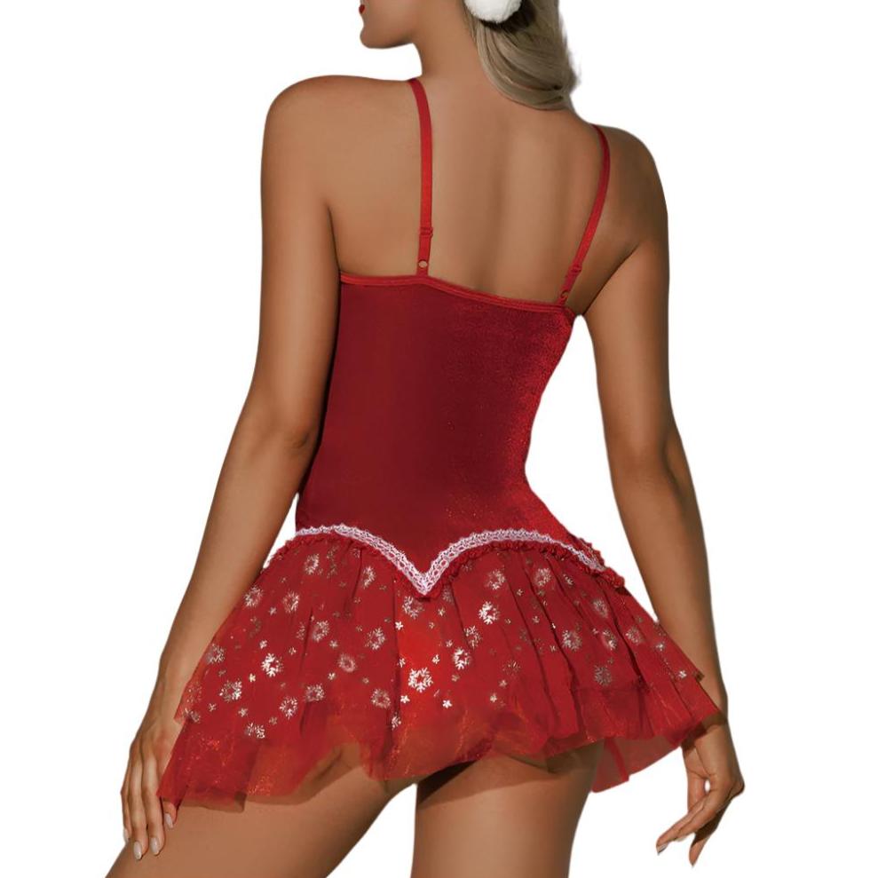 This cute Christmassy costume set comes with a flattering red dress made from sumptuous red velvet and a tutu-like tulle skirt with glimmering silver snowflake details, plus a G-string to wear as a sexy surprise underneath, and a Santa hat to top off your look.