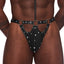 Steal all the attention in the dungeon when you make your entrance wearing the Male Power® Fetish Tormentor Wet Look Studded Thong & Choker!