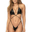 This tantalising one-piece swimsuit lets your body do all the talking from behind a simple yet sexy crossover cage strap detail across your navel that attaches the triangle bikini top to the adjustable thong bottoms. The tie-up criss-cross straps and thong waistband thread through gold O-rings that sit on either side of your waist, creating a super high-cut silhouette that elongates your legs and makes your hips and buns pop like nothing else! The glossy wet look material always looks as though you've just emerged from a refreshing dip under the waves (whether you've actually submerged yourself in the water or not), ensuring you're always dripping with style and sex appeal...