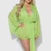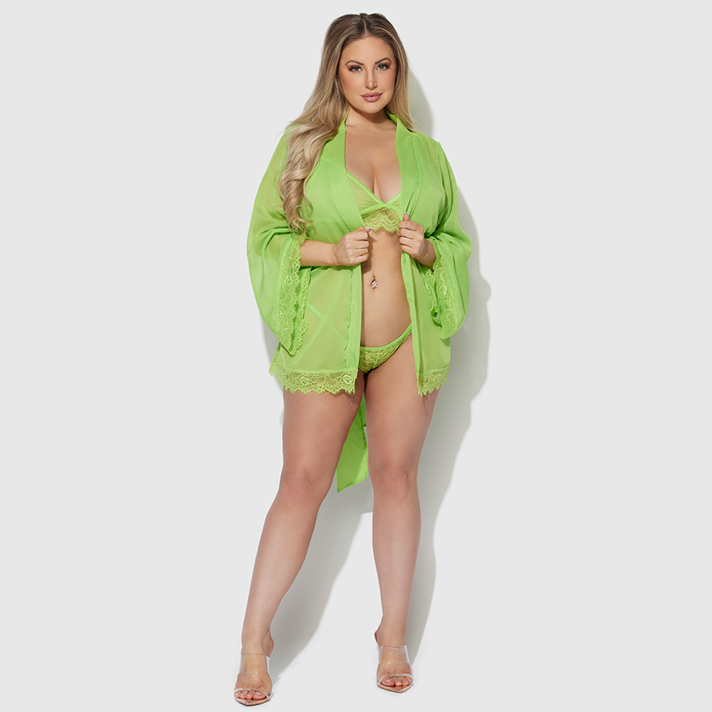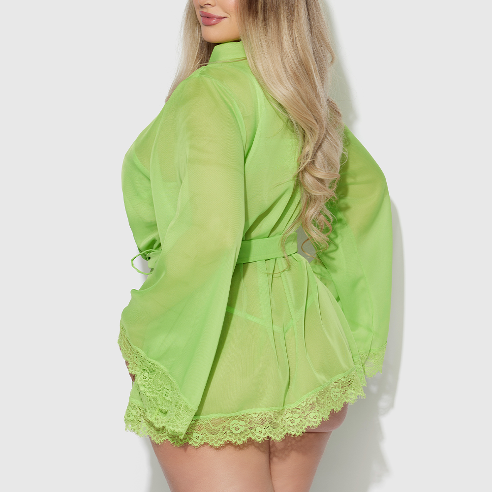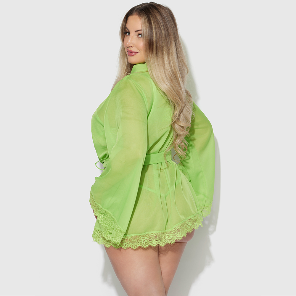 This stunning robe drapes gracefully over your full figure, giving a subtle glimpse of your skin through the lightly sheer fabric. Its playful short length offers a cheeky view of your buns with every step you take while the scalloped eyelash lace on the sleeves and hem adds a soft, wispy effect to your movement. Whether left open to reveal your alluring lingerie or tied at the waist to accentuate your curves, this robe is an easy yet elegant way to spice up lounging around the house!