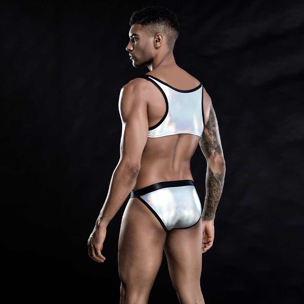 Turn heads in the bedroom, at adult festivals, or kink parties with the Men's Holographic Crop Singlet & Brief Set from JSY!