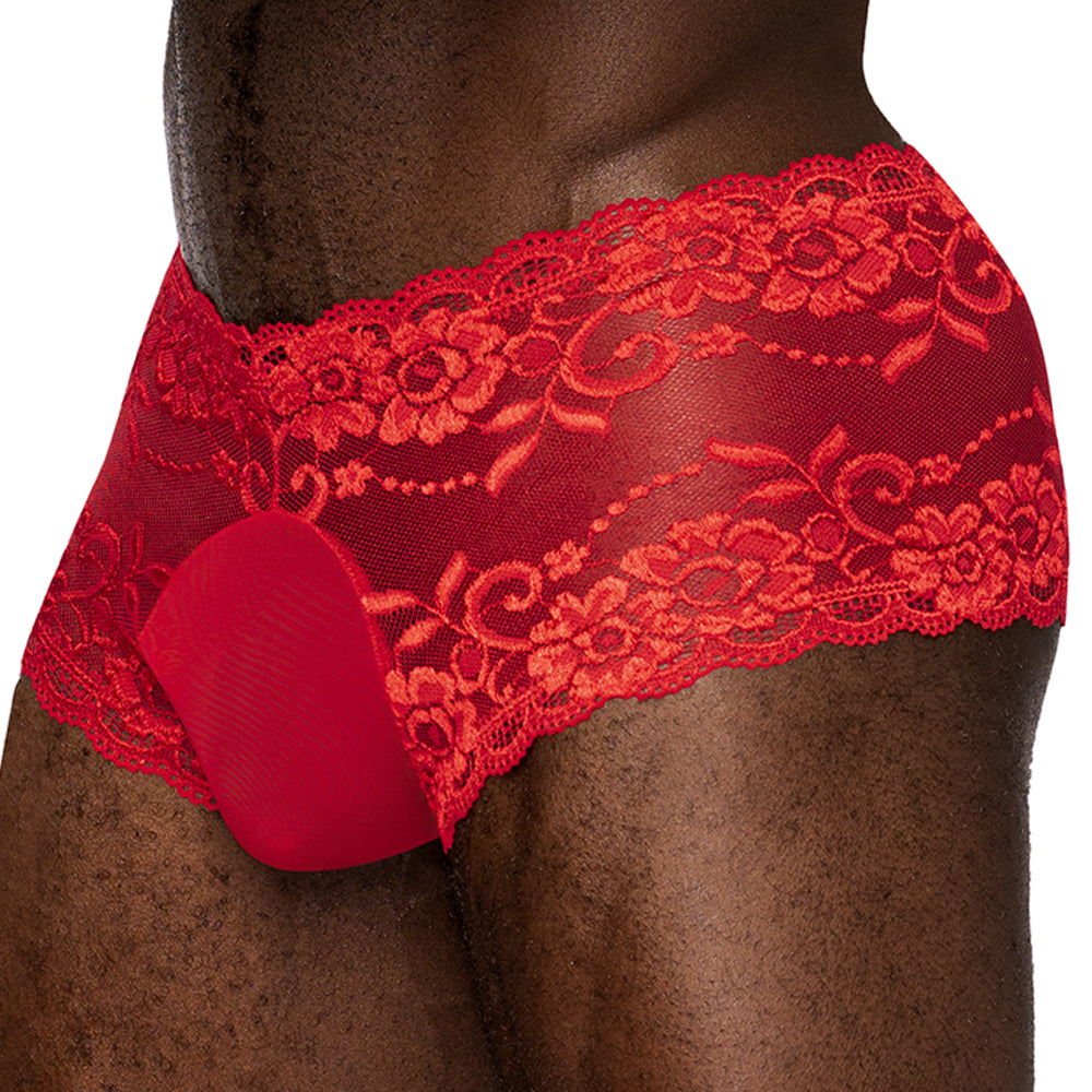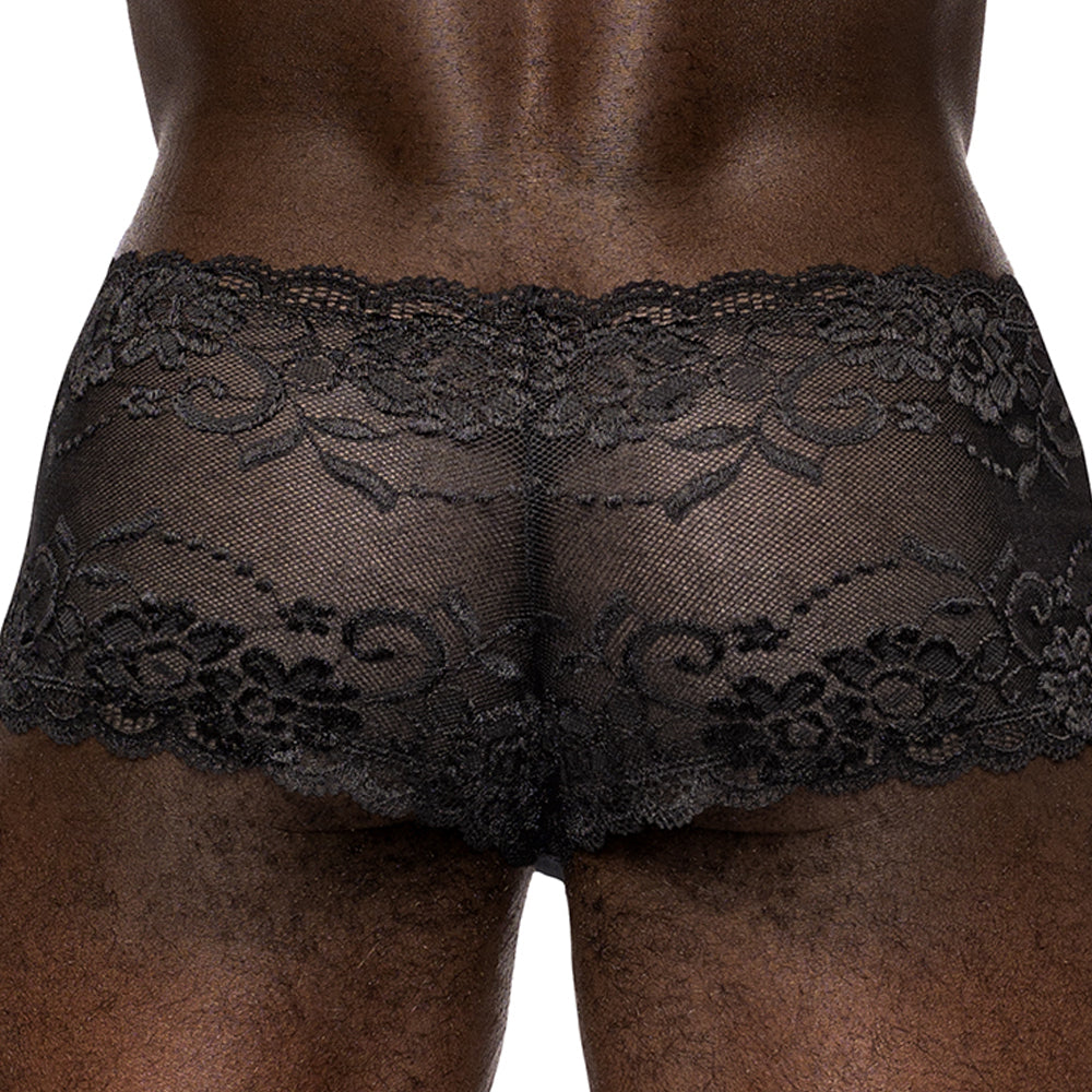 These classic trunk-cut mini shorts put an elegant twist on men's underwear with a sensual floral lace pattern and soft scalloped edges around the legs and waist. The opaque pouch keeps your package under wraps while the sheer stretch mesh material lets your skin breathe through the shorts and accentuates your buns with a flattering fit. The low-rise design offers a modern fit and is perfect for keeping hidden or letting peek out from the rest of your outfit!