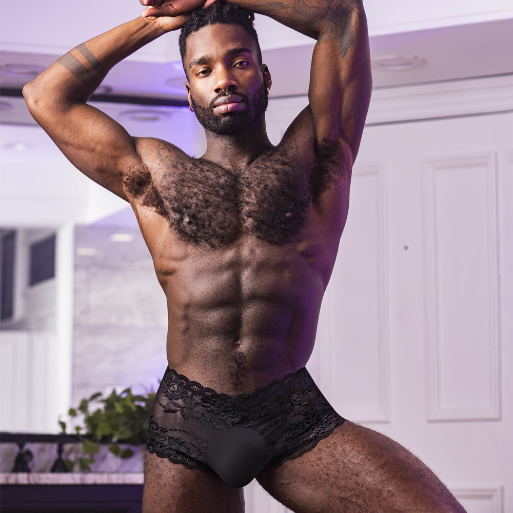 Get in touch with your feminine side in the Male Power® Sheer Sassy Lace Solid Pouch Mini Short!