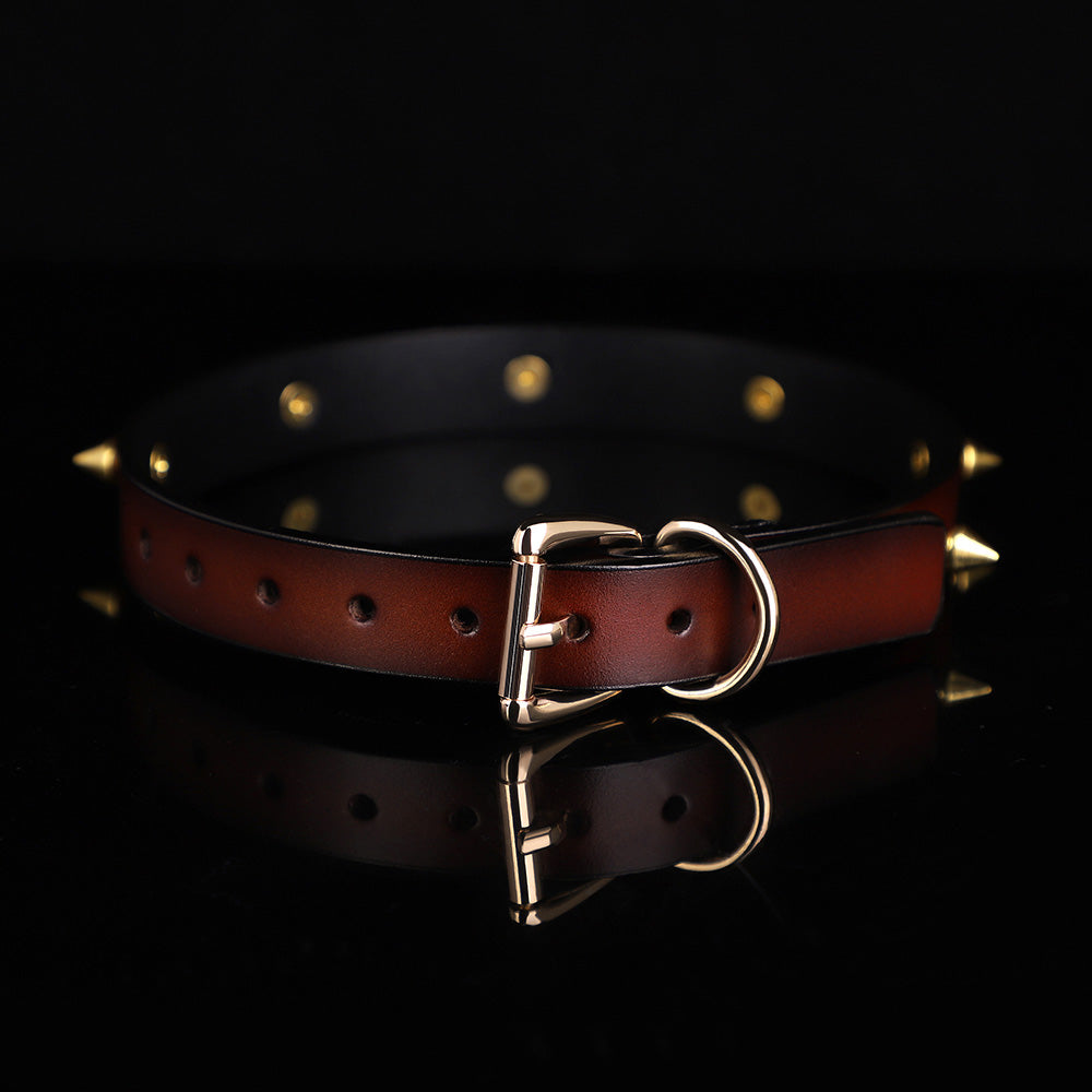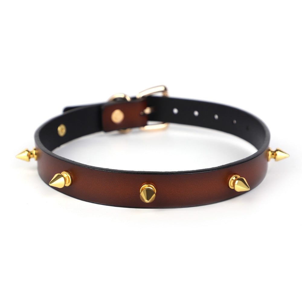 This eye-catching choker necklace is made from smooth, firm brown leather with burnished edges for a uniquely stylish finish. It's studded with alt-chic spikes in a stunning shade of gold rather than the classic silver that everyone expects when it comes to spiked dog collars, giving a unique country-meets-punk vibe that's sure to turn heads! Simply adjust the rear buckle until you find your perfect fit and you're ready to rock this look!