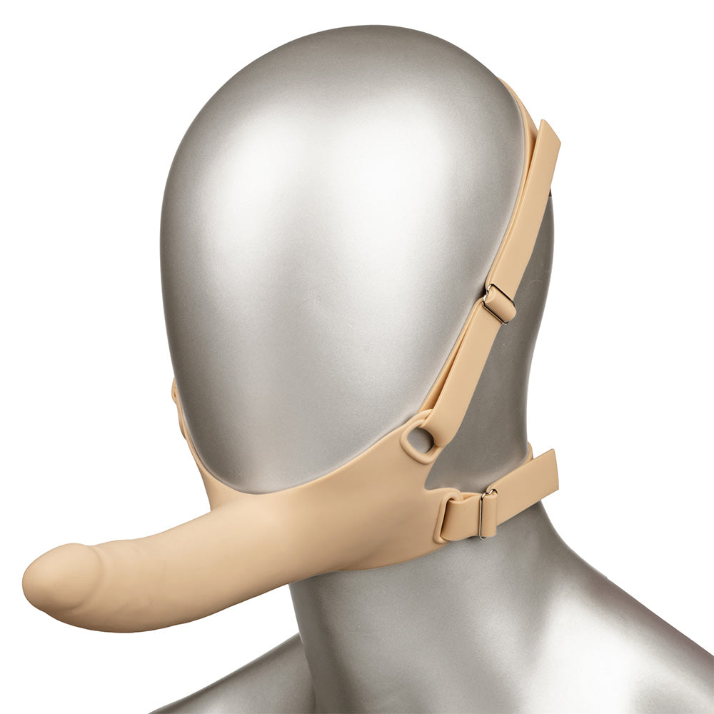 The smooth and stretchy straps fit comfortably over the wearer's head around the wearer's jaw and the back of their head and are adjustable via sliding buckles to get a comfortable, secure fit. The body-safe solid silicone dildo is compatible with water-based lubricants so you can get a smooth glide the whole time and is fully waterproof so it's easy to clean and get ready to accommodate your needs the next time you want to play!