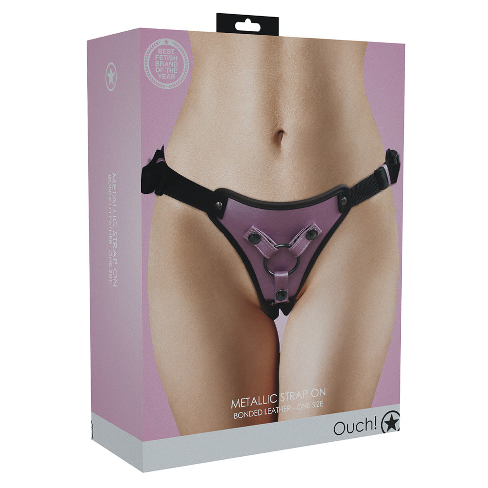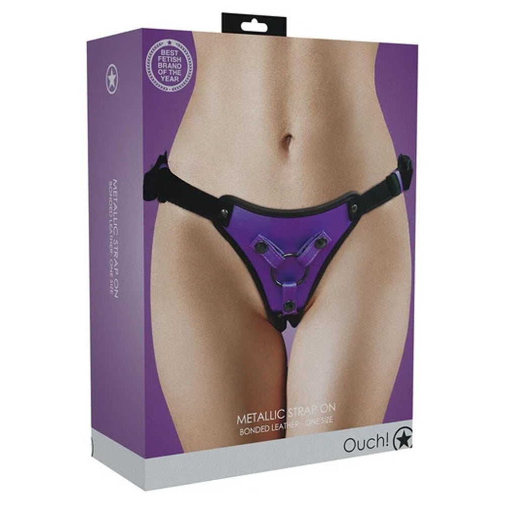 Enhance your intimate experiences in style with the Ouch! Metallic Vegan Bonded Leather Strap-On Harness!