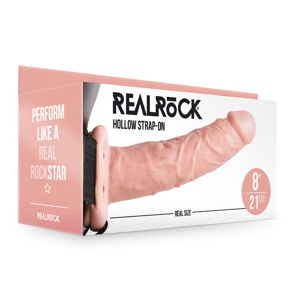Enhance your bedroom play with extra girth and length thanks to RealRock's® Realistic 8" Hollow Strap-On Dildo & Harness!