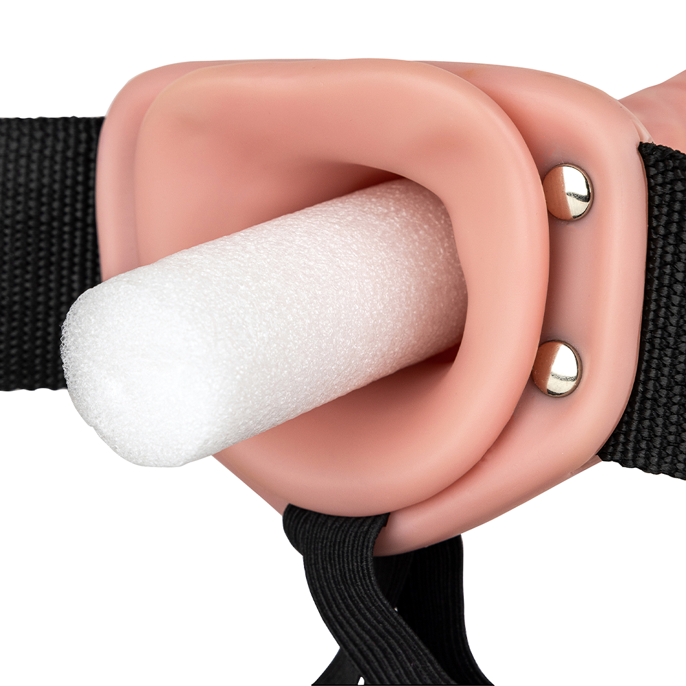 This firm yet fleshy hollow strap-on is shaped just like the real deal with a phallic head and veiny shaft that will massage your partner's insides with every stroke and thrust. The upwards curve in the shaft guides the helmet-like head towards your lover's G-spot or P-spot with ease, helping you hit their sweetest spots just right! The hollow design slips over your penis while it's flaccid or erect and comes with a firm foam core that you can trim to size to provide extra support inside the hollow dildo during play. The waistband is nice and wide for comfortable wear and has fully adjustable straps at the hips and thighs for a secure fit that stays put, no matter how wild the ride gets...