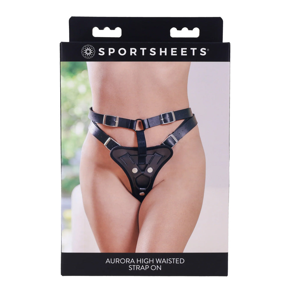 Embrace your commanding presence with the domineering look and feel of the Aurora High Waisted Faux Leather Strap-On Harness from Sportsheets®!