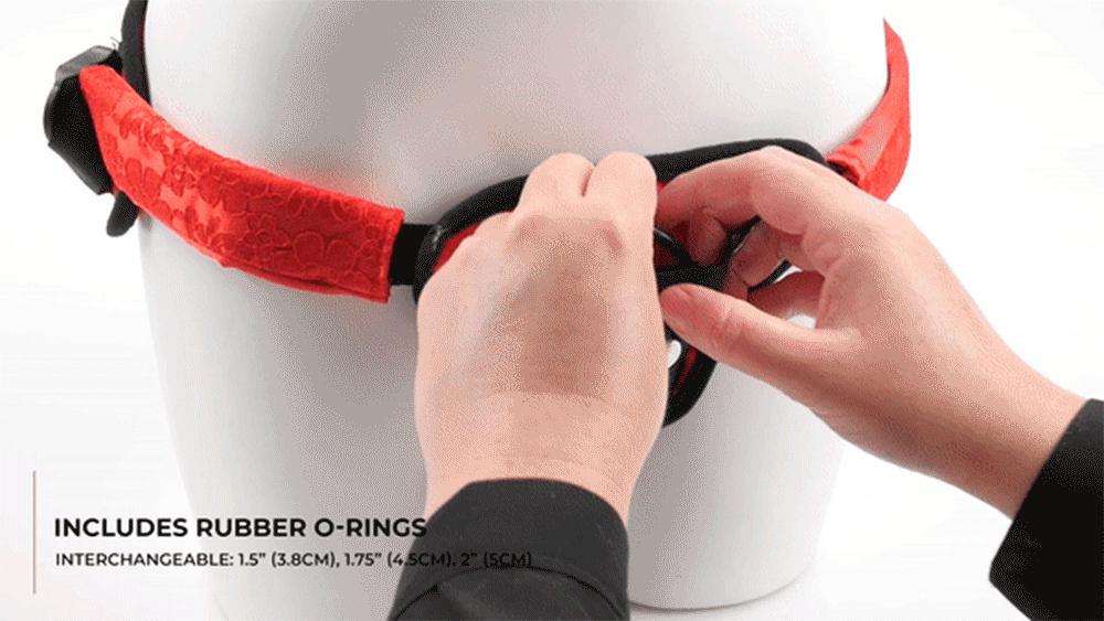 This gorgeous strap-on harness is made of plush red lace and features a sultry corset-style lacing detail in the rear with 4-way adjustable straps to give you the perfect fit to accentuate your assets. The material is also machine-washable for your convenience after the fun is done!