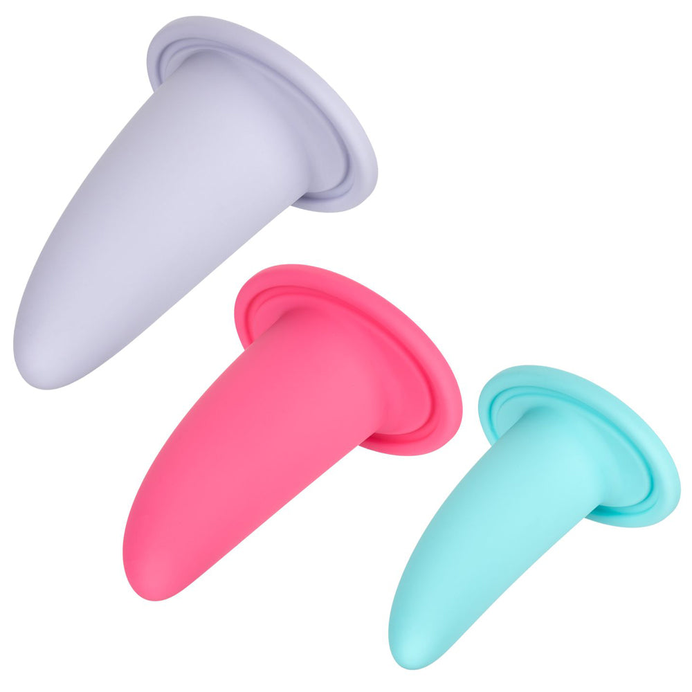 This uniquely designed kit contains 3 silicone dilators that gradually increase in size so you can increase the width and depth of your vagina at your own pace. These dilators are ergonomically curved and tapered to allow for gentle insertion and are hollow so you can place a vibrating bullet inside to increase your pleasure while dilating! The unique wearable design features a flexible flanged base for comfort and ease of mobility over long periods of time so you can get on with your daily tasks while boosting your pelvic health.