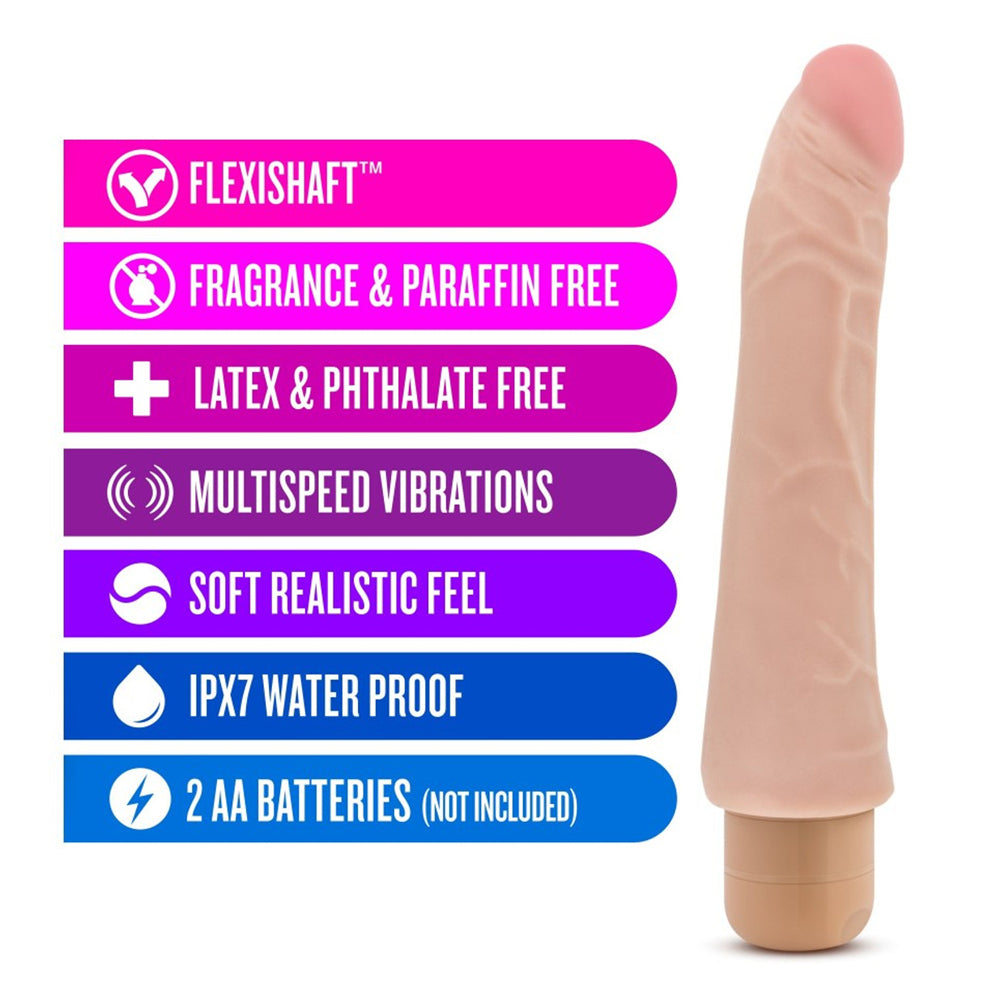 This battery-powered vibrator is sculpted with phallic details for a lifelike look and feel, all the way from the ridged head to the very base of its veiny shaft. The slight curve in the shaft also helps the head target your G-spot so you can get what you need, where you need it. The FlexiShaft™ technology inside gives this dildo a firm yet flexible finish that moves with your body for maximum comfort and stimulation that's always on target!
