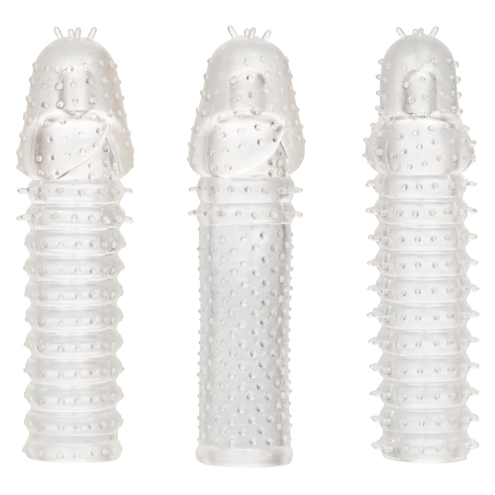Satisfy your lover like never before with this 3-Piece Textured Penis Extension Sleeve Kit!