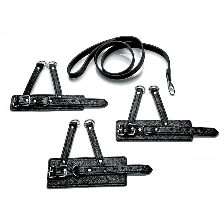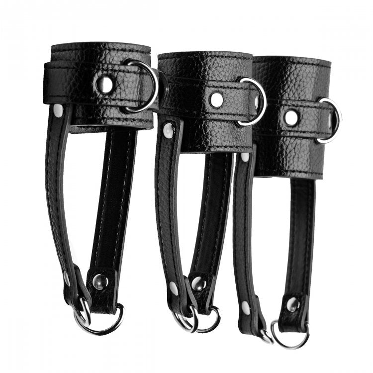 This set includes 3 differently-sized scrotum harnesses and a detachable leash. The differing widths of the harness provide different levels of forced stretching and all the harnesses are adjustable so you can ensure a perfect fit on your slave. The long leash has a simple snap hook closure with a wrist loop so you can maintain control over your captive and lead them around by the balls with ease! The harnesses are made from easy-to-clean and durable PU leather, with sturdy metal D-rings for attaching weights, ropes, or other accessories – your merciless imagination is the only limit...