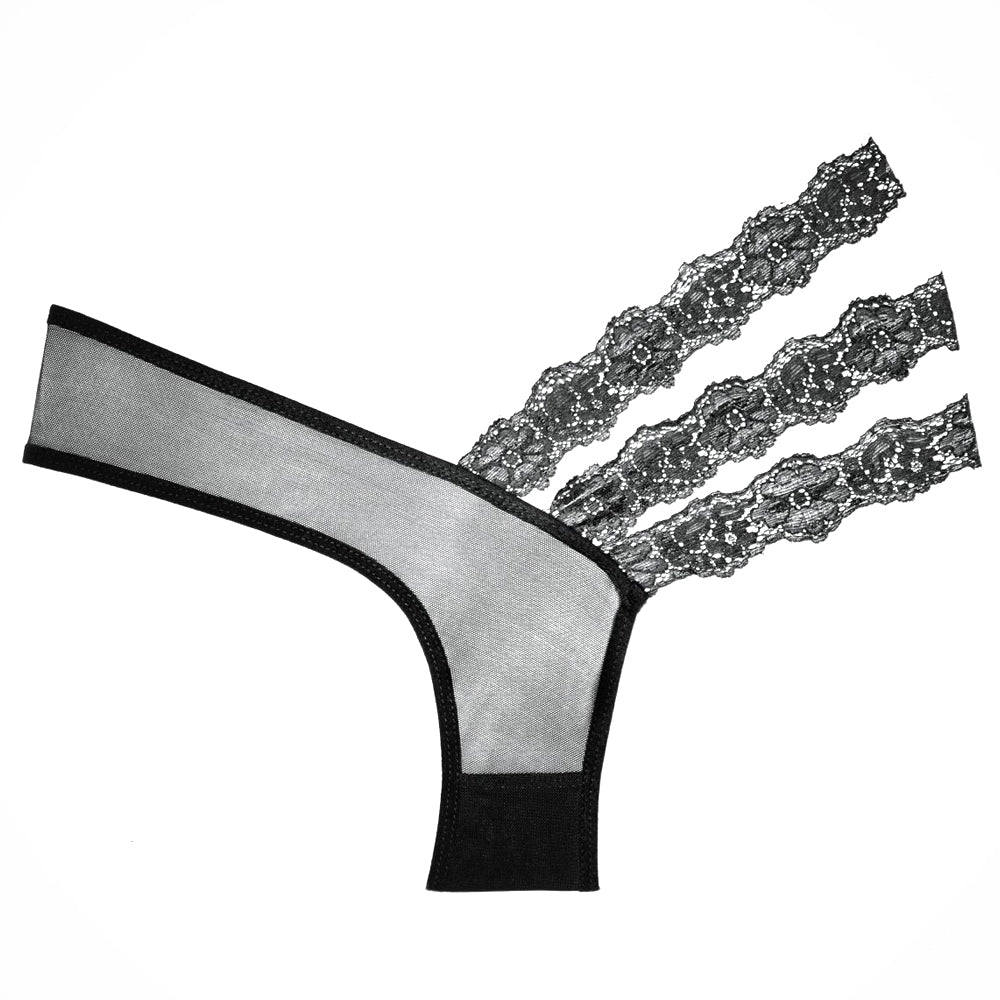 These sexy panties feature an asymmetrical design, with a trio of scalloped floral lace bands adorning one of your hips for a striking visual effect. Meanwhile, the rest of your intimate assets are covered by sheer mesh that lets your skin peek through, all in a classic bikini-cut design!