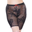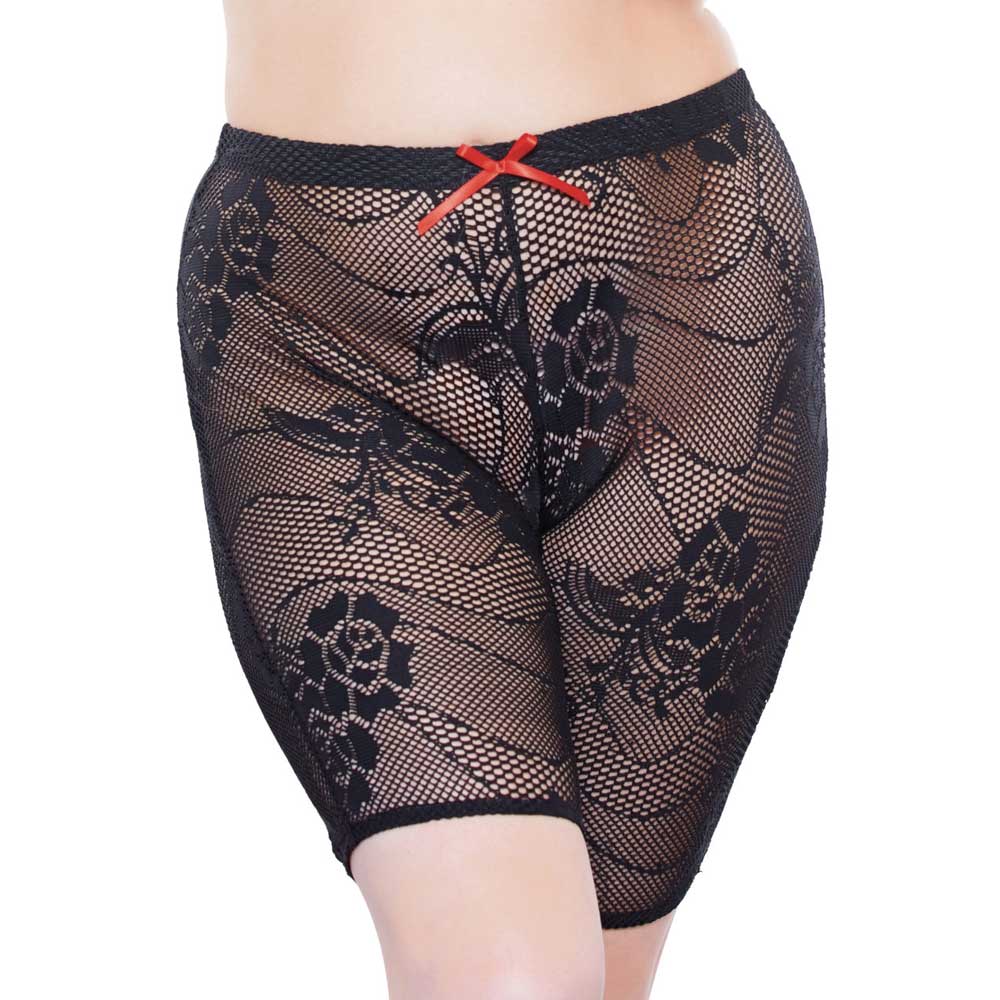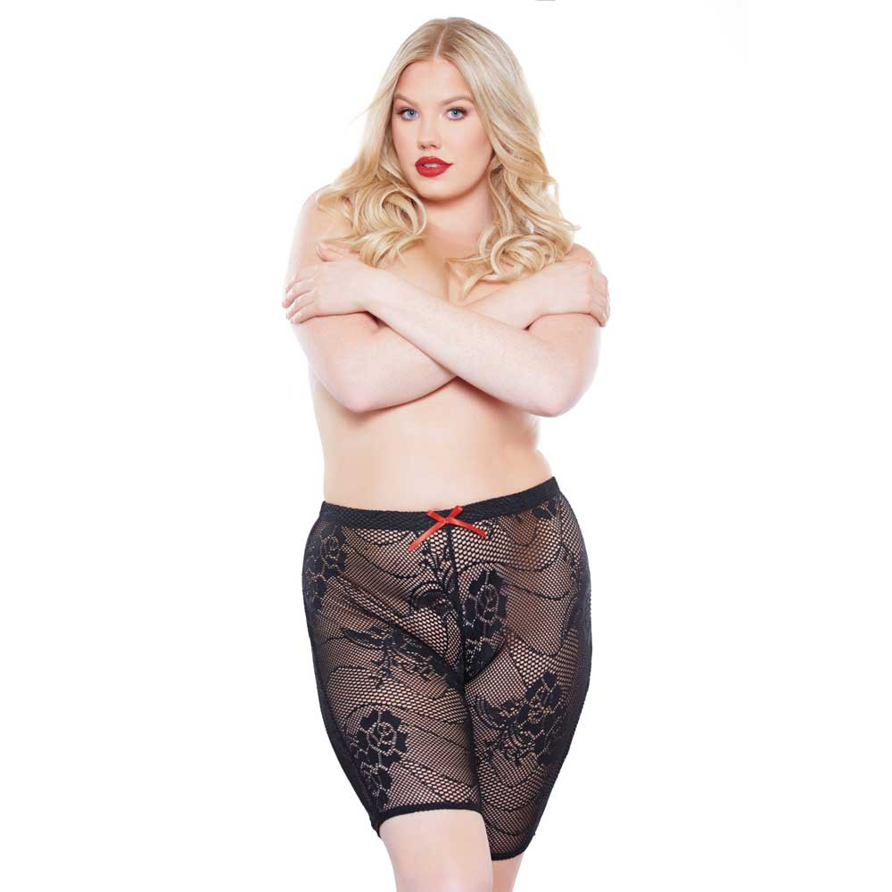 These plus-sized mesh shorts are as comfortable as they are sexy, featuring a crochet-like open weave that shows off hints of your skin and a flattering above-knee length. The elastic waist and leg cuffs make the Allure Kitten Harlowe Biker Shorts easy for curvy women to wear and remove while the breathable fabric is perfect for wearing alone or as a sexy surprise under your everyday clothing. The floral motif and red ribbon at the waist add an elegant touch of femininity back to this biker chic look.