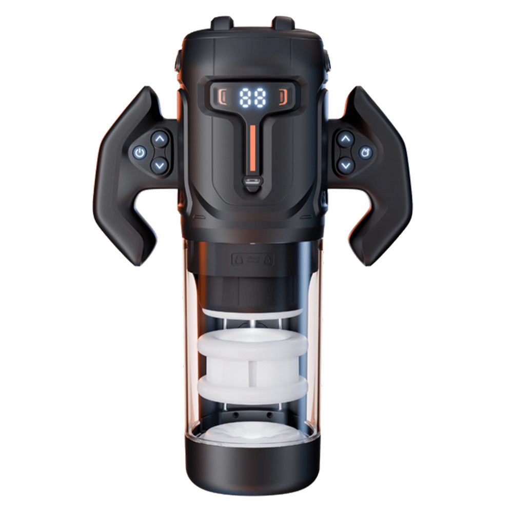 The Amovibe Turbo Masturbator is designed with a unique game controller-like body, letting you control all your settings with an intuitive 6-button control panel (3 buttons per side). Hold the power button on the left to turn on your Amovibe Turbo and use the ^ and v buttons to choose from 4 synchronised thrusting and rotation patterns, the number of which will be shown on the left side of the LED display. On the right, the ^ and v buttons let you increase or decrease the speed across 4 levels (shown on the right side of the LED display) — there's also a One-Click Climax button that automatically sets the machine's frequency and speed to the highest power while you hold it down for maximum pleasure!